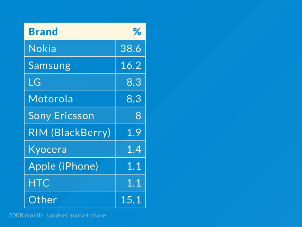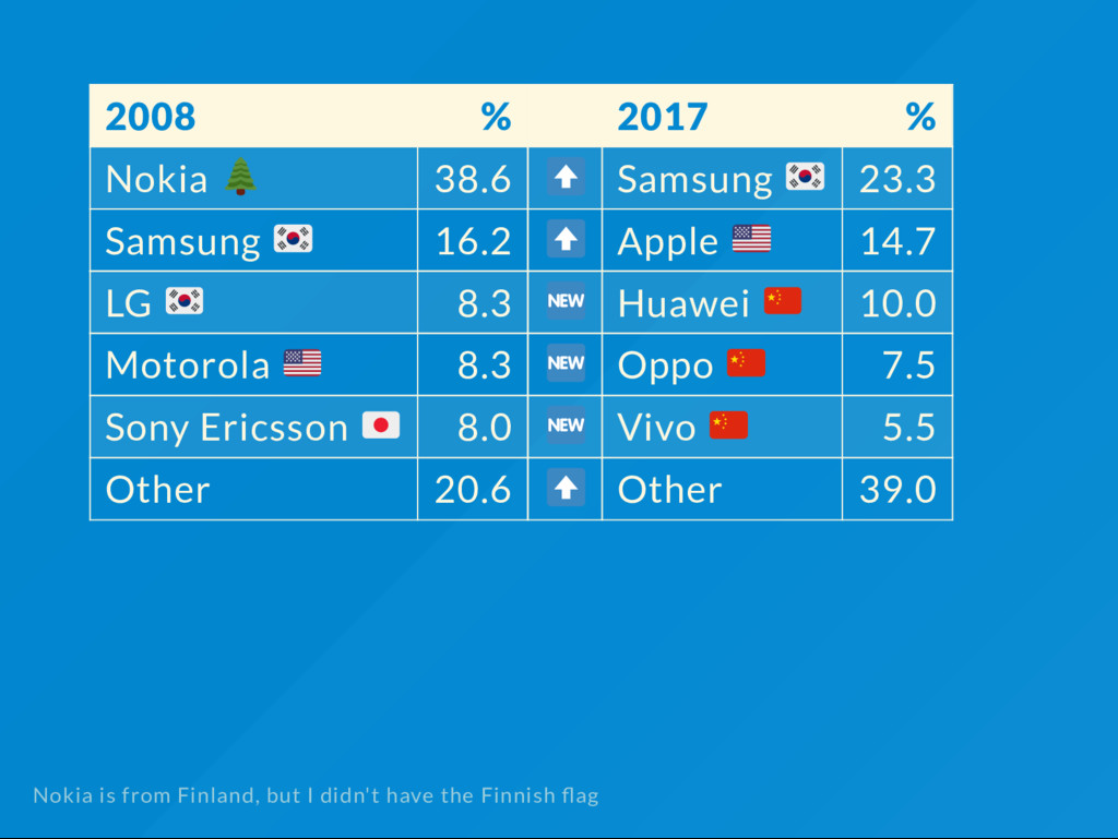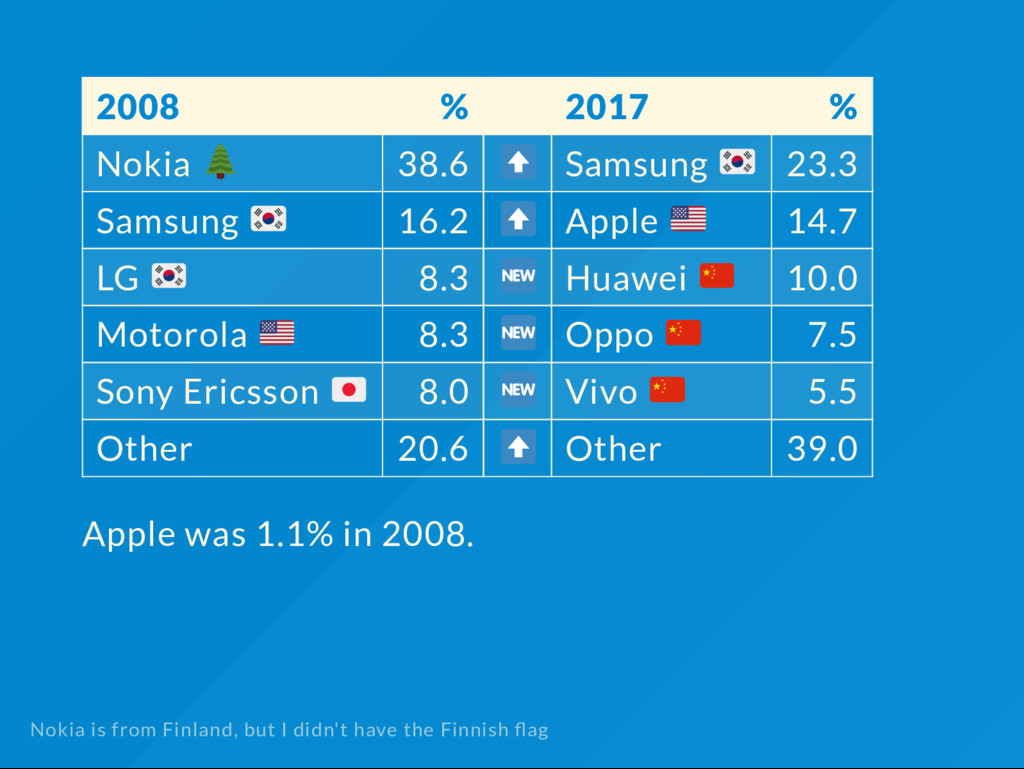 Apple 14.7 LG 8.3 Huawei 10.0 Motorola 8.3 Oppo 7.5 Sony Ericsson 8.0 Vivo 5.5 Other 20.6 Other 39.0 Apple was 1.1% in 2008. Nokia is from Finland, but I didn't have the Finnish ag