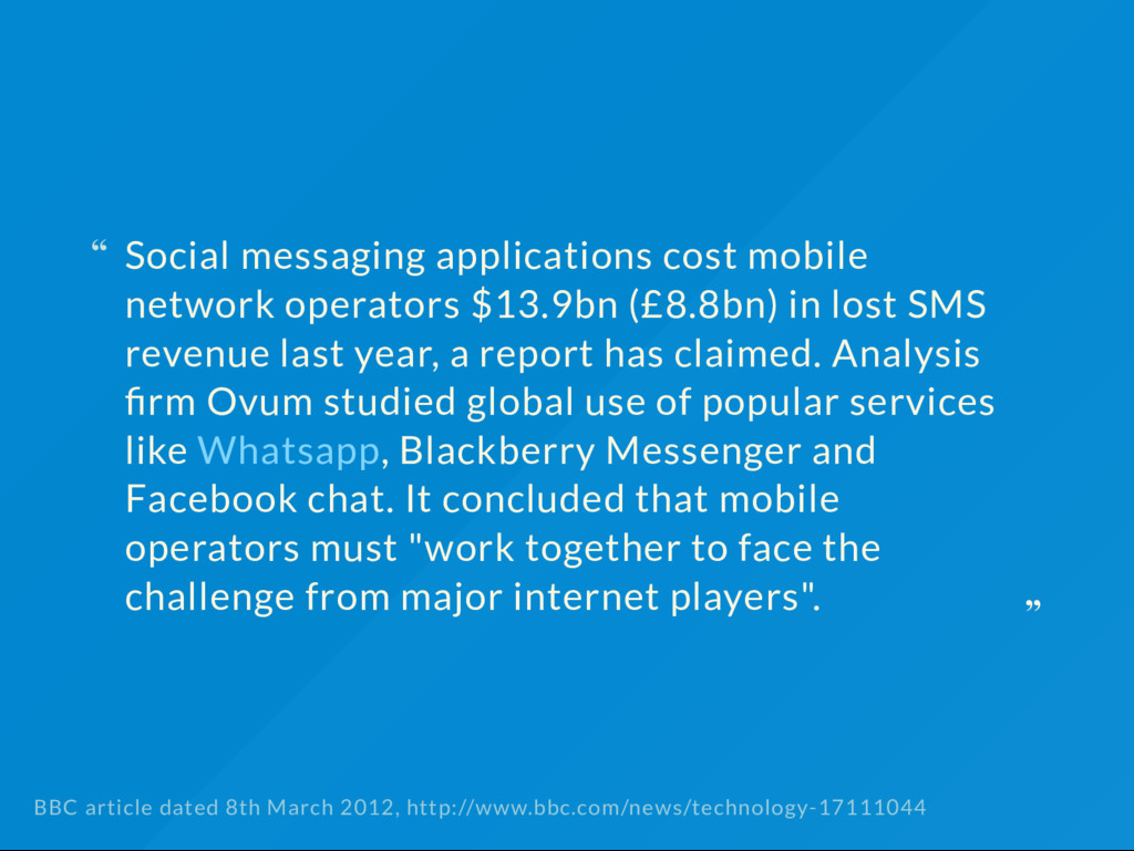 lost SMS revenue last year, a report has claimed. Analysis rm Ovum studied global use of popular services like Whatsapp, Blackberry Messenger and Facebook chat. It concluded that mobile operators must "work together to face the challenge from major internet players". “ “ BBC article dated 8th March 2012, http://www.bbc.com/news/technology-17111044