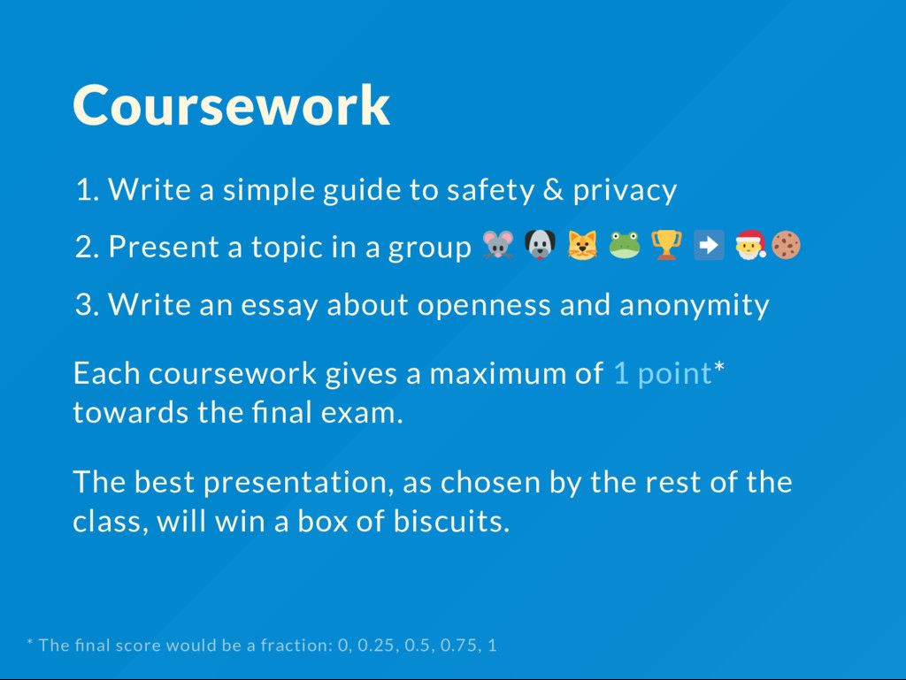2. Present a topic in a group 3. Write an essay about openness and anonymity Each coursework gives a maximum of 1 point* towards the nal exam. The best presentation, as chosen by the rest of the class, will win a box of biscuits. * The nal score would be a fraction: 0, 0.25, 0.5, 0.75, 1