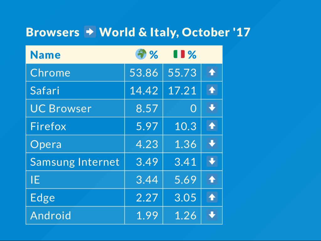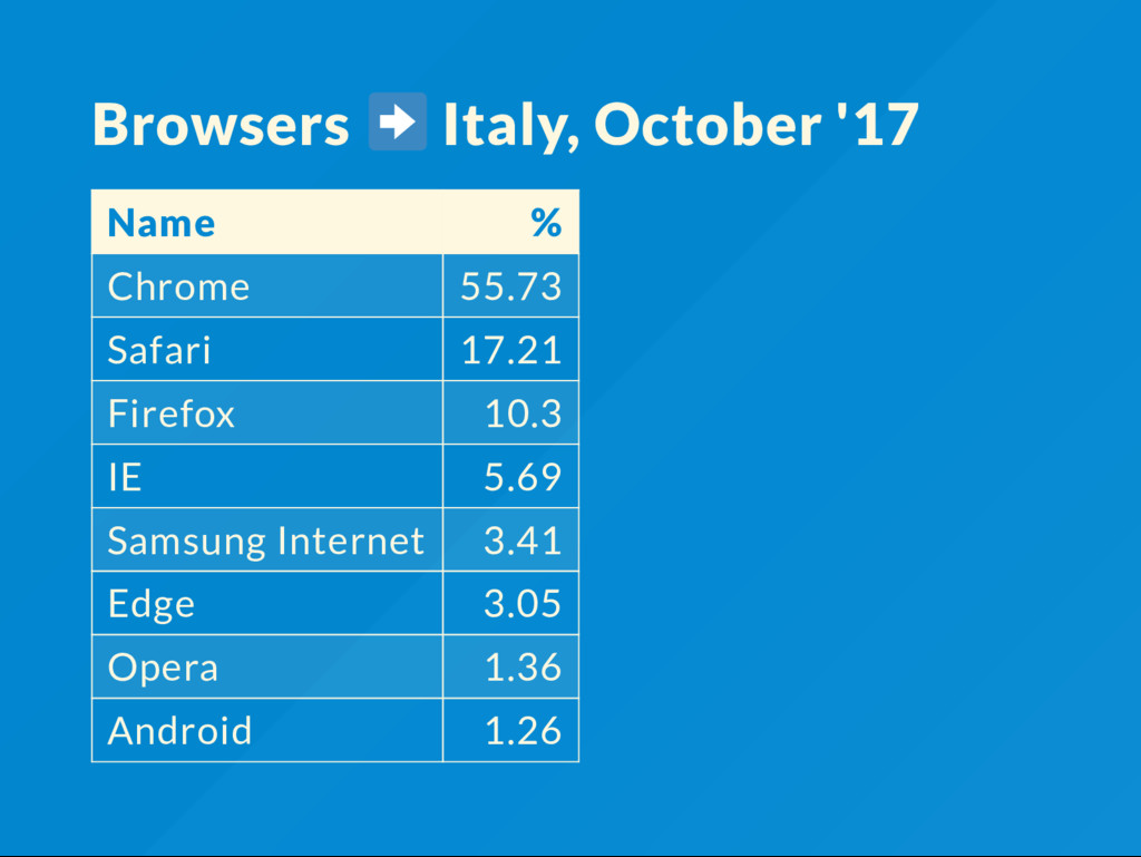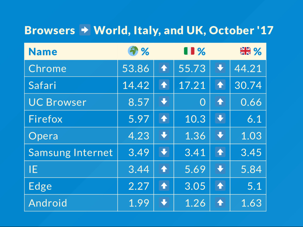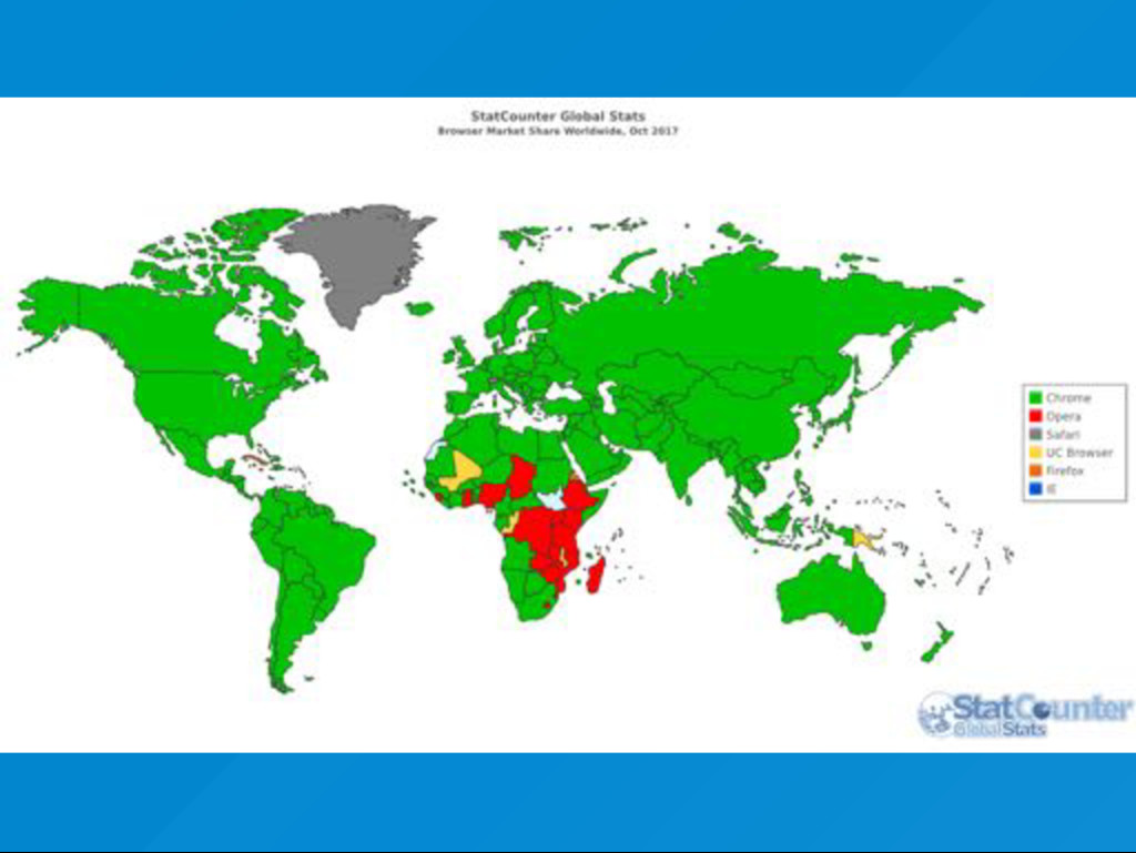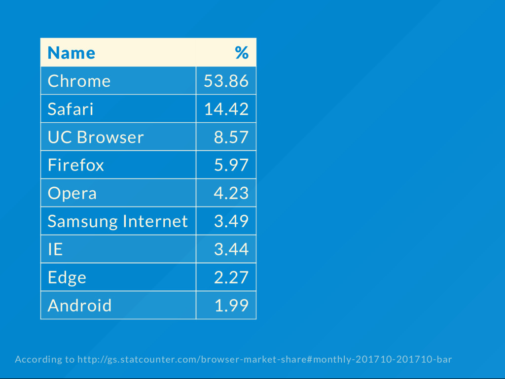5.97 Opera 4.23 Samsung Internet 3.49 IE 3.44 Edge 2.27 Android 1.99 According to http://gs.statcounter.com/browser-market-share#monthly-201710-201710-bar