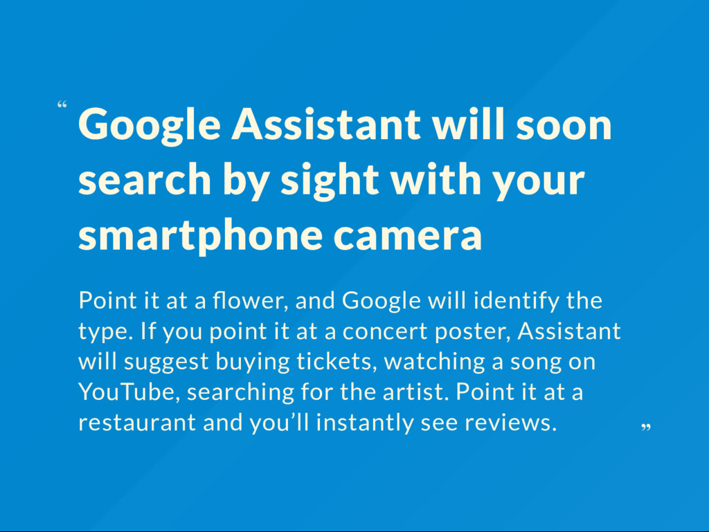 camera Point it at a ower, and Google will identify the type. If you point it at a concert poster, Assistant will suggest buying tickets, watching a song on YouTube, searching for the artist. Point it at a restaurant and you’ll instantly see reviews. “ “