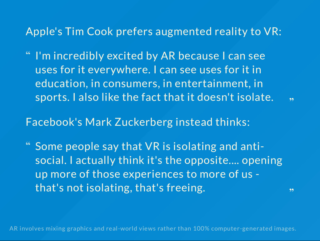 Zuckerberg instead thinks: I'm incredibly excited by AR because I can see uses for it everywhere. I can see uses for it in education, in consumers, in entertainment, in sports. I also like the fact that it doesn't isolate. “ “ Some people say that VR is isolating and anti- social. I actually think it's the opposite.... opening up more of those experiences to more of us - that's not isolating, that's freeing. “ “ AR involves mixing graphics and real-world views rather than 100% computer-generated images.