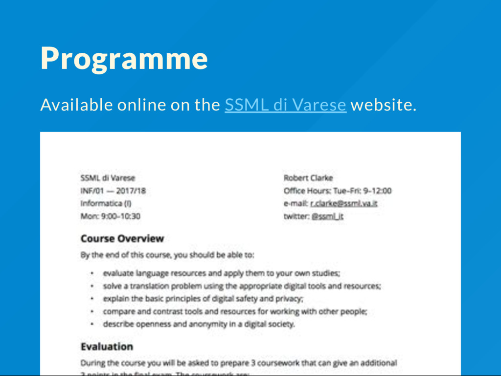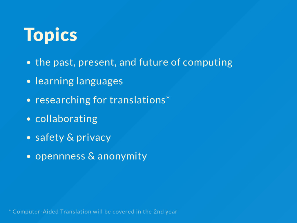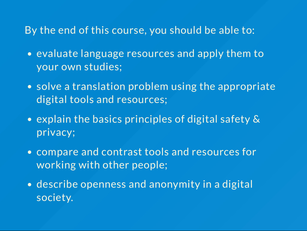 to: evaluate language resources and apply them to your own studies; solve a translation problem using the appropriate digital tools and resources; explain the basics principles of digital safety & privacy; compare and contrast tools and resources for working with other people; describe openness and anonymity in a digital society.