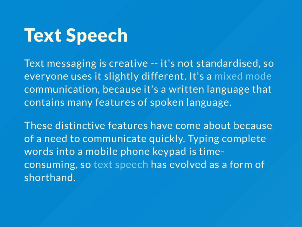 so everyone uses it slightly different. It's a mixed mode communication, because it's a written language that contains many features of spoken language. These distinctive features have come about because of a need to communicate quickly. Typing complete words into a mobile phone keypad is time- consuming, so text speech has evolved as a form of shorthand.