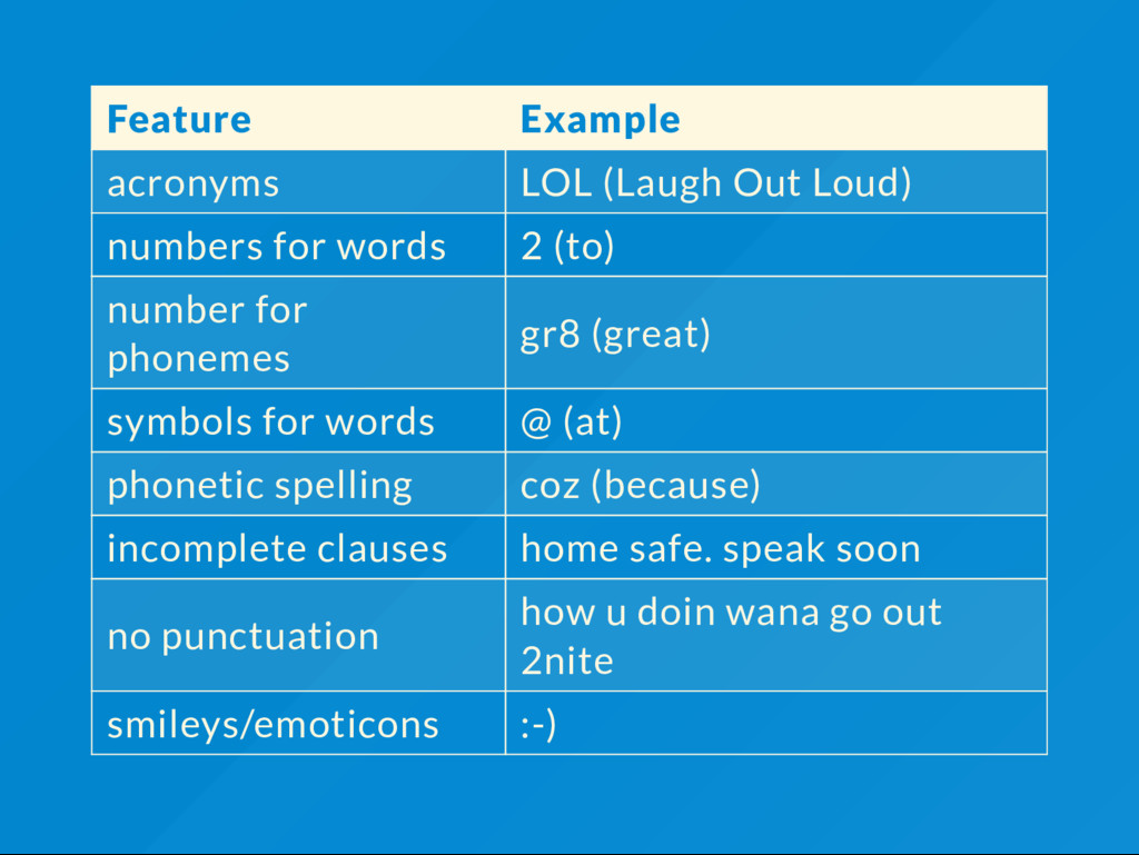 2 (to) number for phonemes gr8 (great) symbols for words @ (at) phonetic spelling coz (because) incomplete clauses home safe. speak soon no punctuation how u doin wana go out 2nite smileys/emoticons :-)