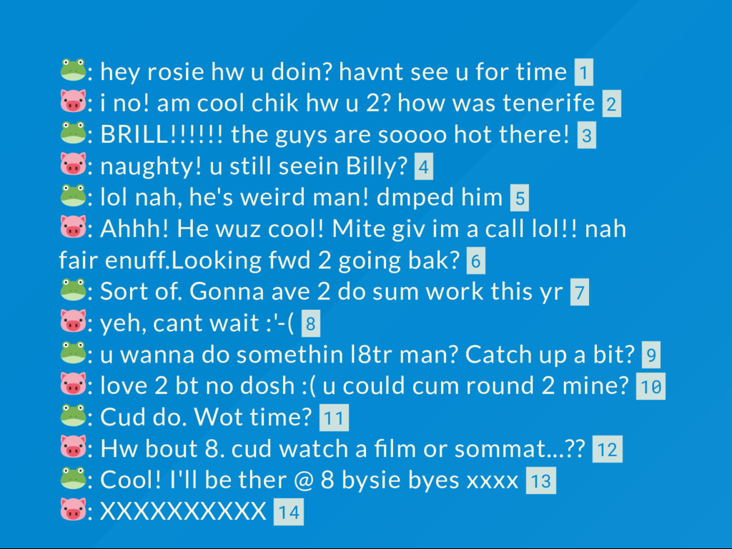 time 1 : i no! am cool chik hw u 2? how was tenerife 2 : BRILL!!!!!! the guys are soooo hot there! 3 : naughty! u still seein Billy? 4 : lol nah, he's weird man! dmped him 5 : Ahhh! He wuz cool! Mite giv im a call lol!! nah fair enuff.Looking fwd 2 going bak? 6 : Sort of. Gonna ave 2 do sum work this yr 7 : yeh, cant wait :'-( 8 : u wanna do somethin l8tr man? Catch up a bit? 9 : love 2 bt no dosh :( u could cum round 2 mine? 10 : Cud do. Wot time? 11 : Hw bout 8. cud watch a lm or sommat...?? 12 : Cool! I'll be ther @ 8 bysie byes xxxx 13 : XXXXXXXXXX 14