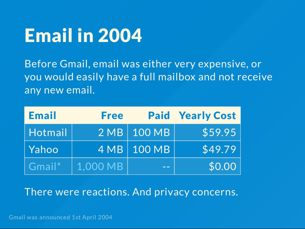 or you would easily have a full mailbox and not receive any new email. Email Free Paid Yearly Cost Hotmail 2 MB 100 MB $59.95 Yahoo 4 MB 100 MB $49.79 Gmail* 1,000 MB -- $0.00 There were reactions. And privacy concerns. Gmail was announced 1st April 2004