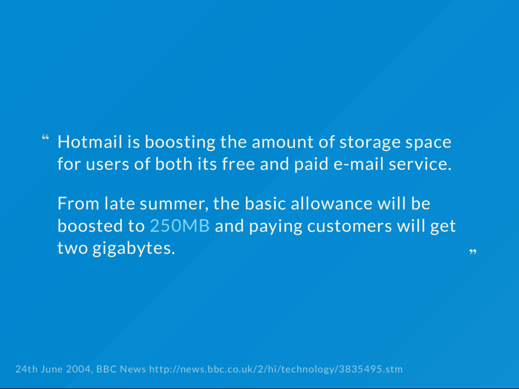 of both its free and paid e-mail service. From late summer, the basic allowance will be boosted to 250MB and paying customers will get two gigabytes. “ “ 24th June 2004, BBC News http://news.bbc.co.uk/2/hi/technology/3835495.stm