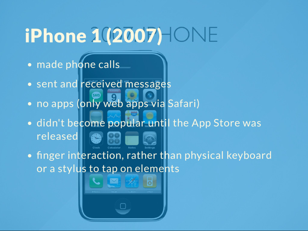 no apps (only web apps via Safari) didn't become popular until the App Store was released nger interaction, rather than physical keyboard or a stylus to tap on elements