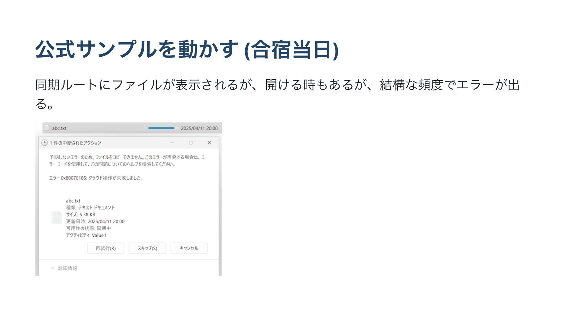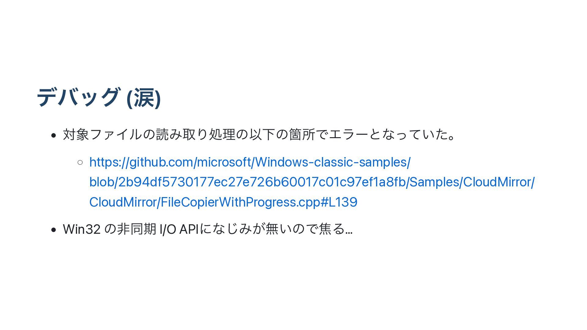 σόοά (ྦ) • ରϑΝΠϧͷಡΈऔΓॲཧͷҎԼͷՕॴͰΤϥʔͱͳ͍ͬͯͨɻ ◦ https://github.com/microsoft/Windows-classic-samples/ blob/2b94df5730177ec27e726b60017c01c97ef1a8fb/Samples/CloudMirror/ CloudMirror/FileCopierWithProgress.cpp#L139 • Win32