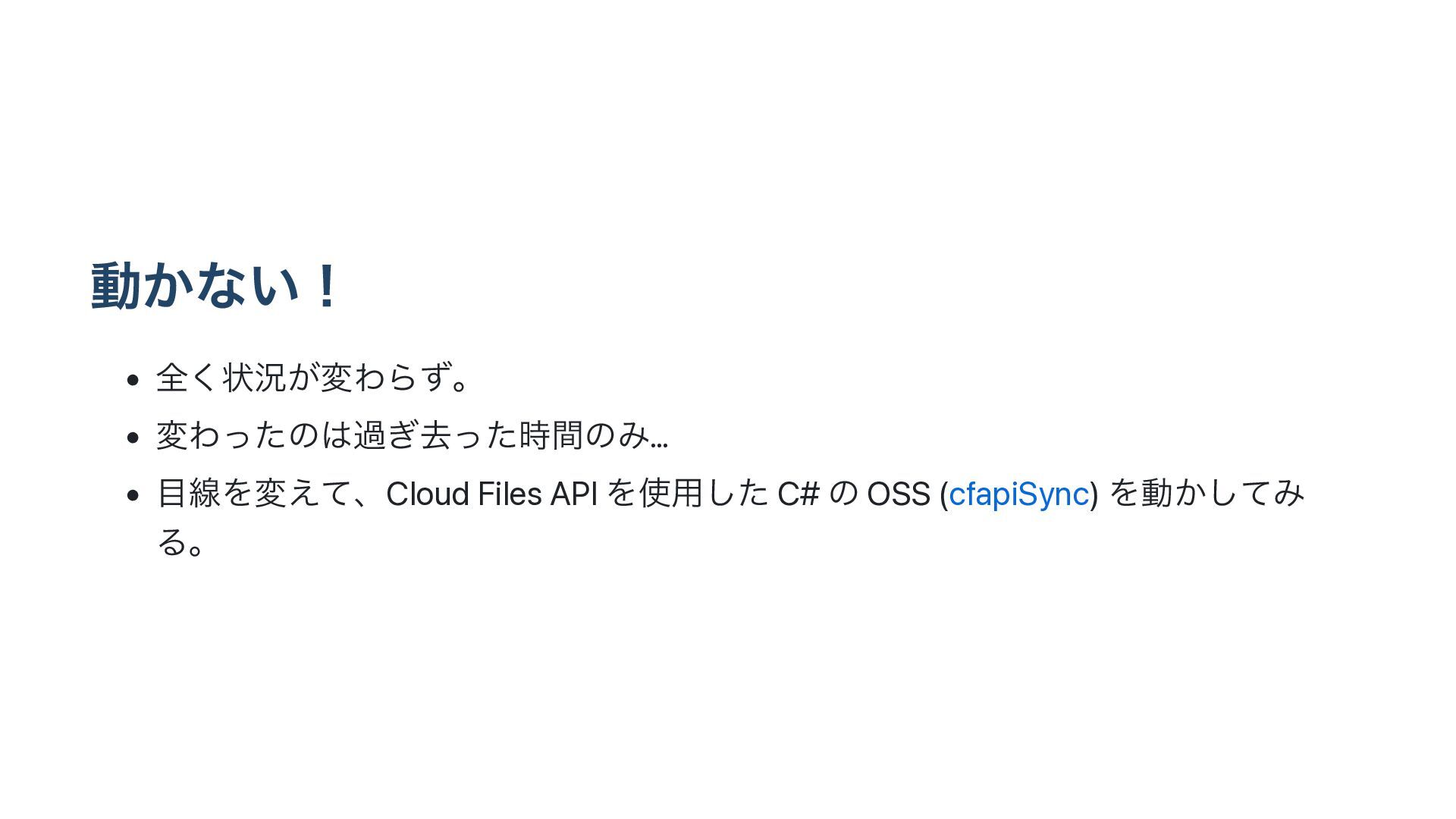 ಈ͔ͳ͍ʂ • શ͘ঢ়گ͕มΘΒͣɻ • มΘͬͨͷա͗ڈͬͨ࣌ؒͷΈ… • ઢΛม͑ͯɺCloud Files API Λ༻ͨ͠