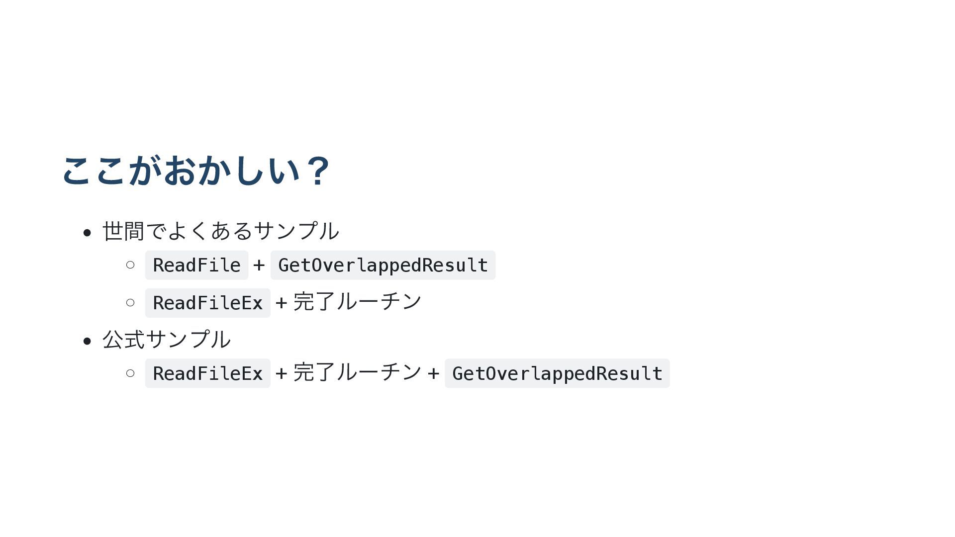 ྃϧʔνϯ • ެࣜαϯϓϧ ◦ ReadFileEx + ྃϧʔνϯ + GetOverlappedResult