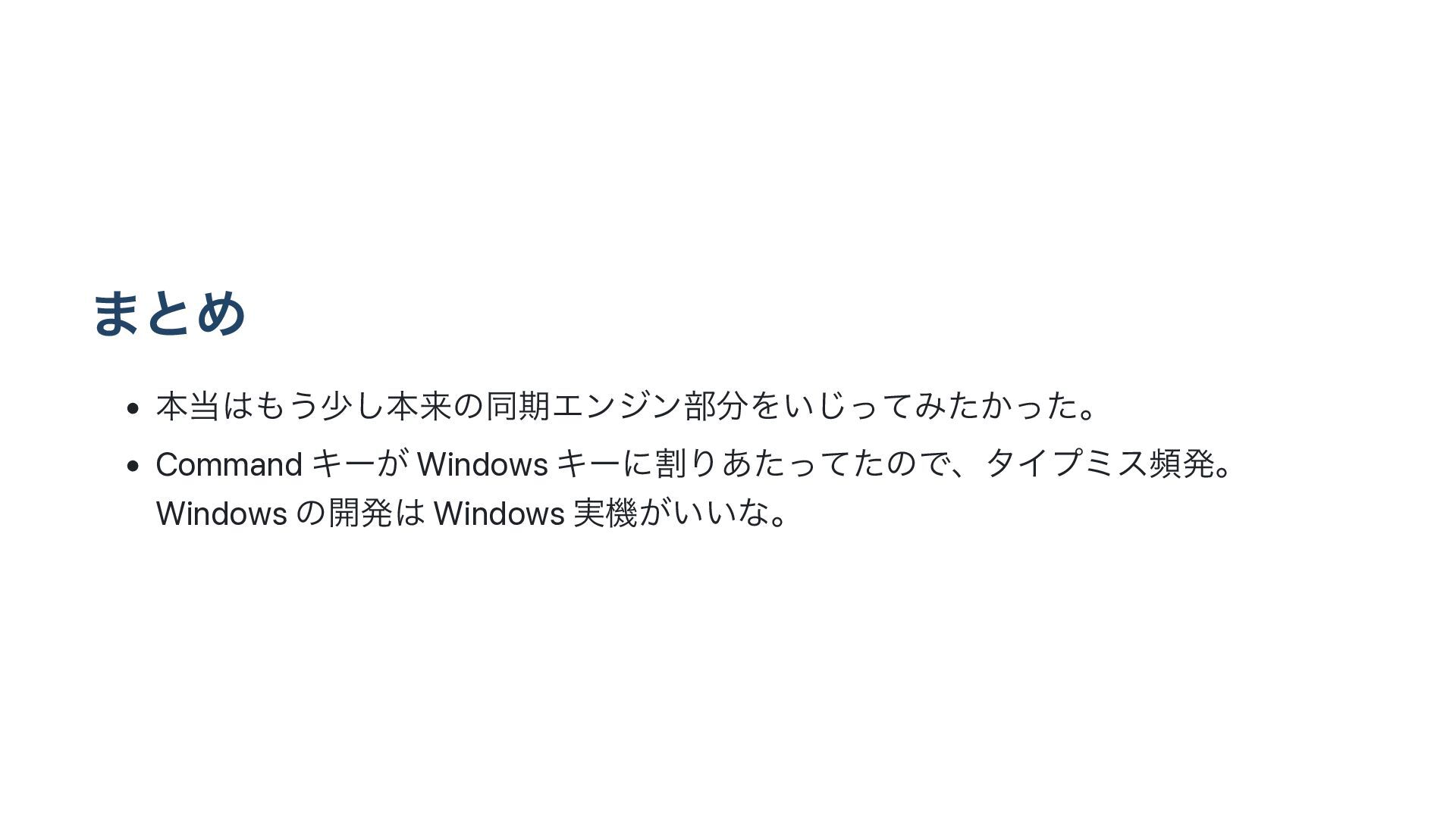 ·ͱΊ • ຊ͏গ͠ຊདྷͷಉظΤϯδϯ෦Λ͍ͬͯ͡Έ͔ͨͬͨɻ • Command Ωʔ͕ Windows ΩʔʹׂΓ͋ͨͬͯͨͷͰɺλΠϓϛεසൃɻ Windows ͷ։ൃ