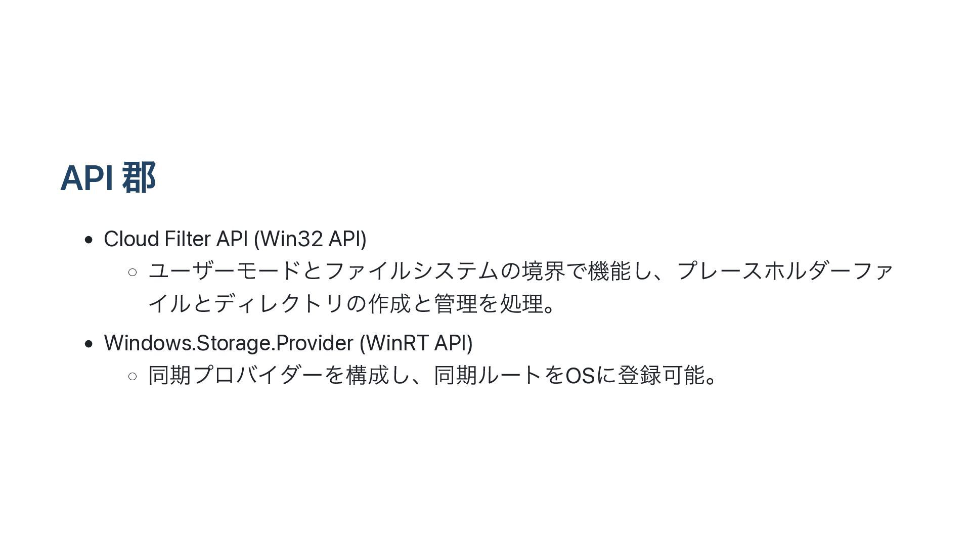 ΠϧͱσΟϨΫτϦͷ࡞ͱཧΛॲཧɻ • Windows.Storage.Provider (WinRT API) ◦ ಉظϓϩόΠμʔΛߏ͠ɺಉظϧʔτΛOSʹొՄೳɻ