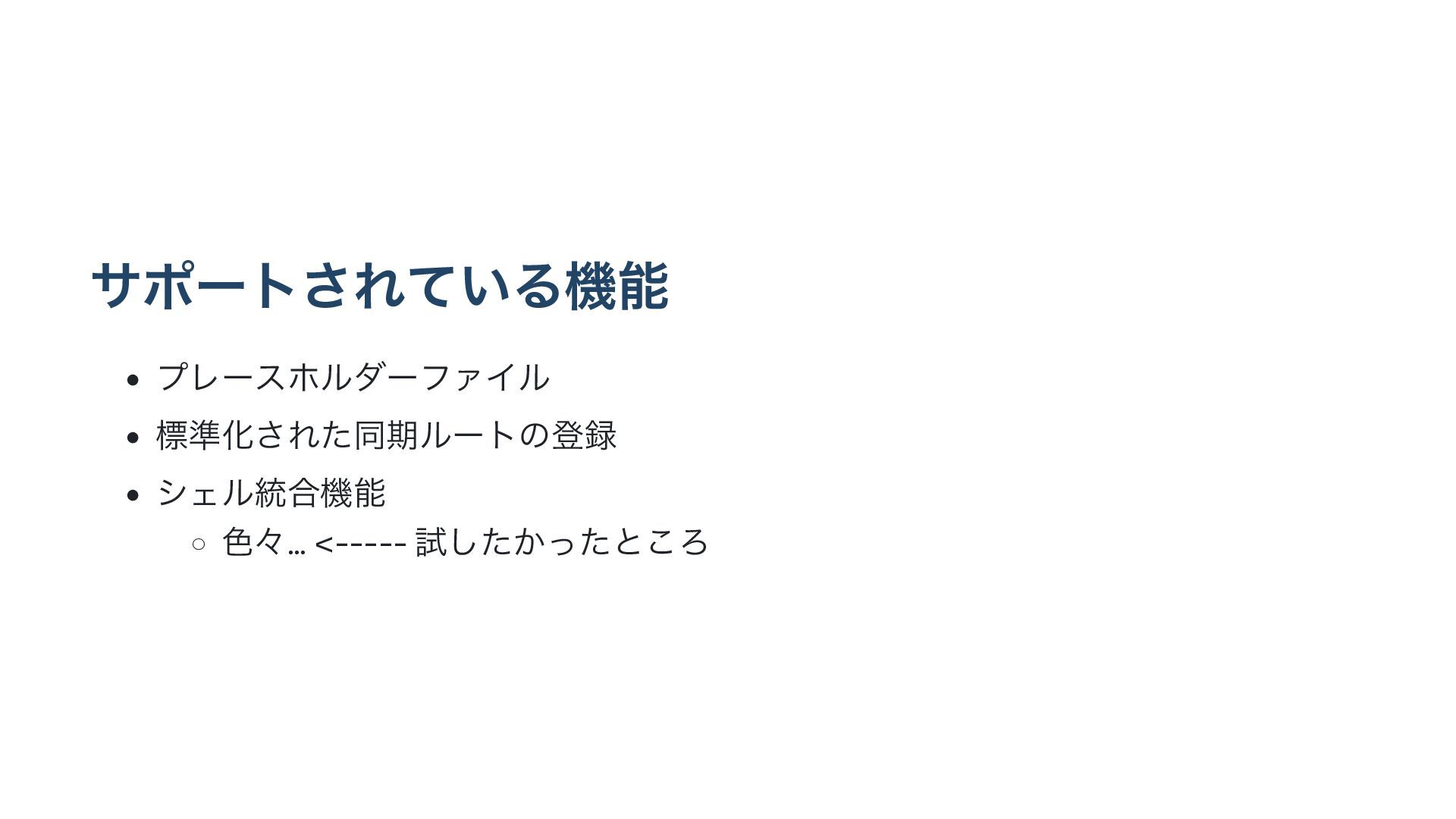 αϙʔτ͞Ε͍ͯΔػೳ • ϓϨʔεϗϧμʔϑΝΠϧ • ඪ४Խ͞Εͨಉظϧʔτͷొ • γΣϧ౷߹ػೳ ◦ ৭ʑ… <-----
