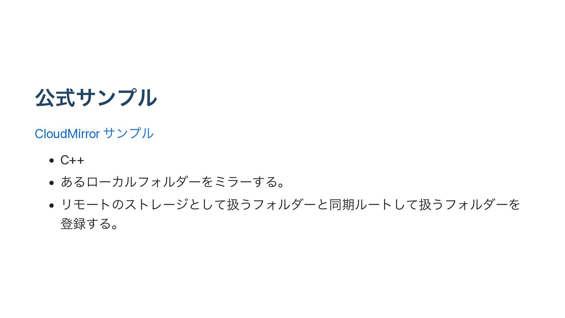 ެࣜαϯϓϧ CloudMirror αϯϓϧ • C++ • ͋ΔϩʔΧϧϑΥϧμʔΛϛϥʔ͢Δɻ • ϦϞʔτͷετϨʔδͱͯ͠ѻ͏ϑΥϧμʔͱಉظϧʔτͯ͠ѻ͏ϑΥϧμʔΛ ొ͢Δɻ