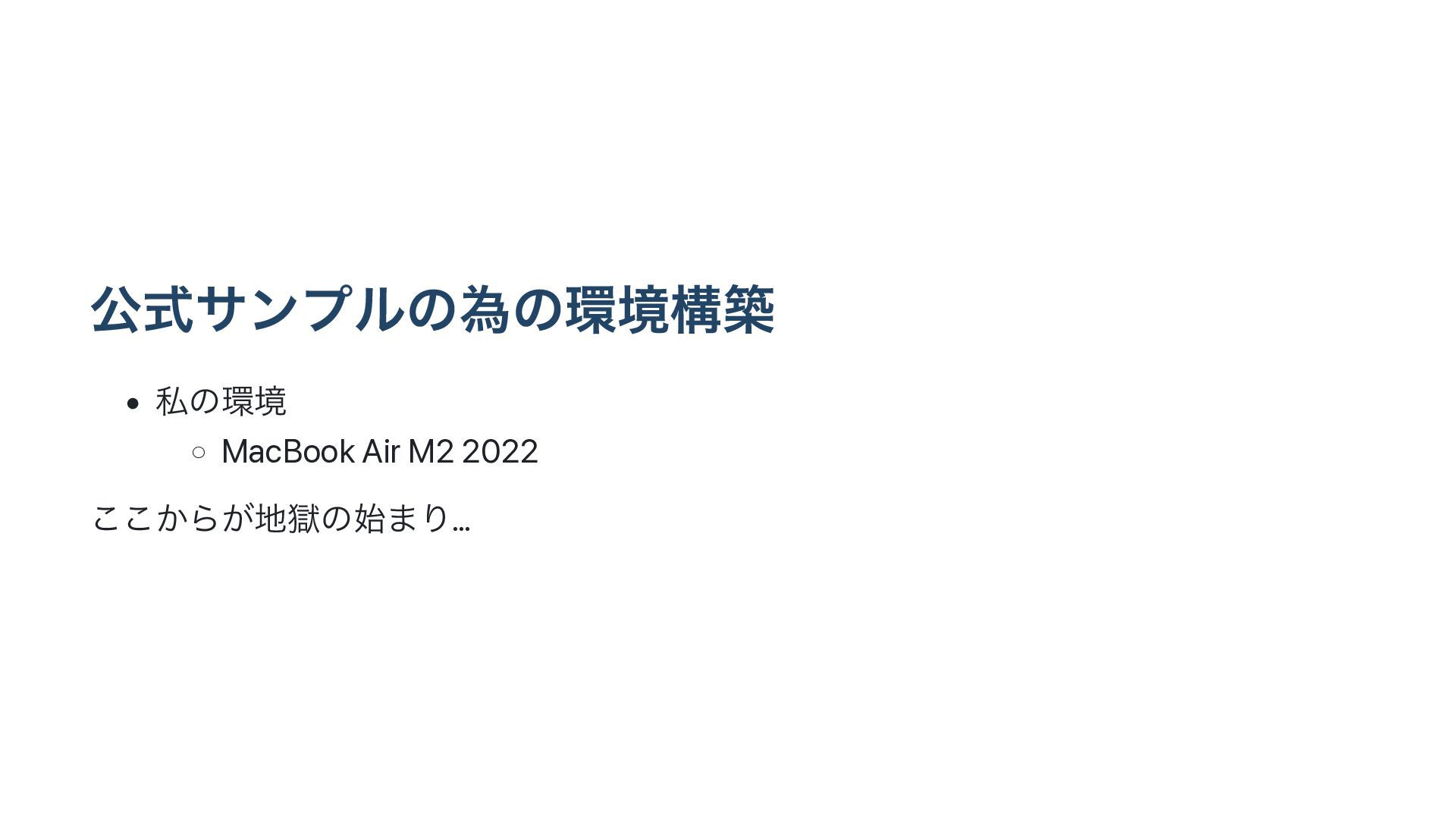 ެࣜαϯϓϧͷҝͷڥߏங • ࢲͷڥ ◦ MacBook Air M2 2022 ͔͜͜Β͕ࠈͷ࢝·Γ…