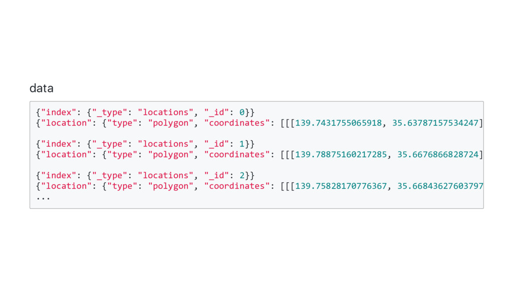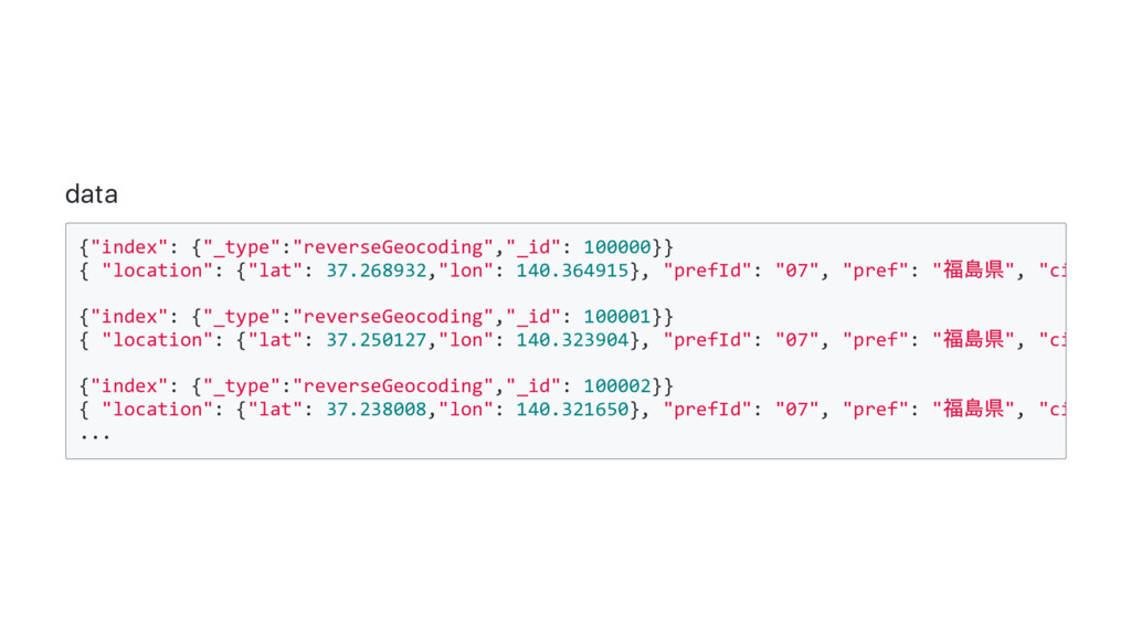 { " _ t y p e " : " r e v e r s e G e o c o d i n g " , " _ i d " : 1 0 0 0 0 0 } } { " l o c a t i o n " : { " l a t " : 3 7 . 2 6 8 9 3 2 , " l o n " : 1 4 0 . 3 6 4 9 1 5 } , " p r e f I d " : " 0 7 " , " p r e f " : " 福島県" , " c i t y I d " { " i n d e x " : { " _ t y p e " : " r e v e r s e G e o c o d i n g " , " _ i d " : 1 0 0 0 0 1 } } { " l o c a t i o n " : { " l a t " : 3 7 . 2 5 0 1 2 7 , " l o n " : 1 4 0 . 3 2 3 9 0 4 } , " p r e f I d " : " 0 7 " , " p r e f " : " 福島県" , " c i t y I d " { " i n d e x " : { " _ t y p e " : " r e v e r s e G e o c o d i n g " , " _ i d " : 1 0 0 0 0 2 } } { " l o c a t i o n " : { " l a t " : 3 7 . 2 3 8 0 0 8 , " l o n " : 1 4 0 . 3 2 1 6 5 0 } , " p r e f I d " : " 0 7 " , " p r e f " : " 福島県" , " c i t y I d " . . .