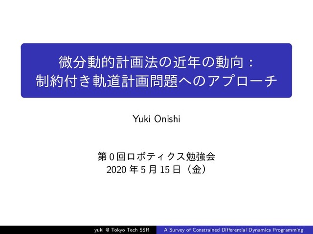 (1) i ∈ {0, 1, . . . , N} はインデックス,xi , f ∈ Rn, ui ∈ Rm. 状態軌道を X = {x0 , x1 , . . . , xN } ∈ Rn×(N+1), 入力軌道を U = {u0 , u1 , . . . , uN−1 } ∈ Rn×N と定義. ⇒ 初期状態 x0 と入力列 U から状態軌道 X が決まる. yuki @ Tokyo Tech SSR A Survey of Constrained Differential Dynamics Programming