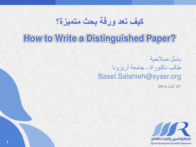 Writing”, University of Arizona, 2014. • Roberto Kolter, “ Why Write? Communicating Your Results to Further Scientific Knowledge”, University of Harvard, 2010. • Simon Jones, “How to Write a Great Research Paper”, accessed at: https://www.youtube.com/watch?v=g3dkRsTqdDA, 2013. • EASE, “Guidelines for Authors and Translators of Scientific Articles to Be Published in English”, 2013.