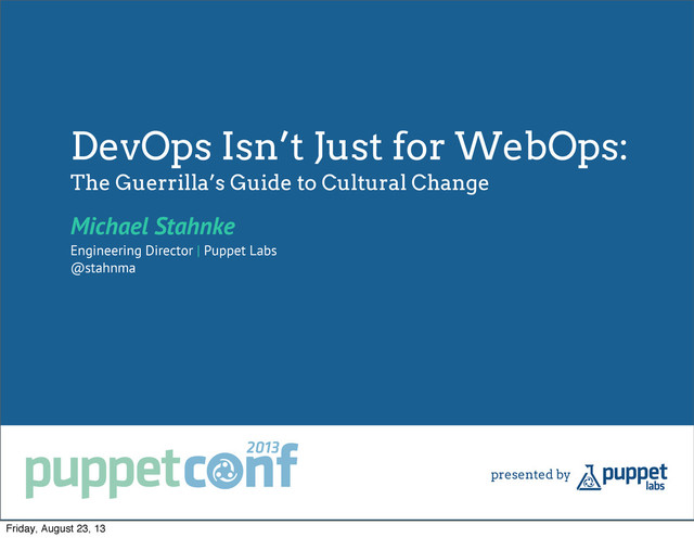 Change Michael Stahnke Engineering Director | Puppet Labs @stahnma Friday, August 23, 13