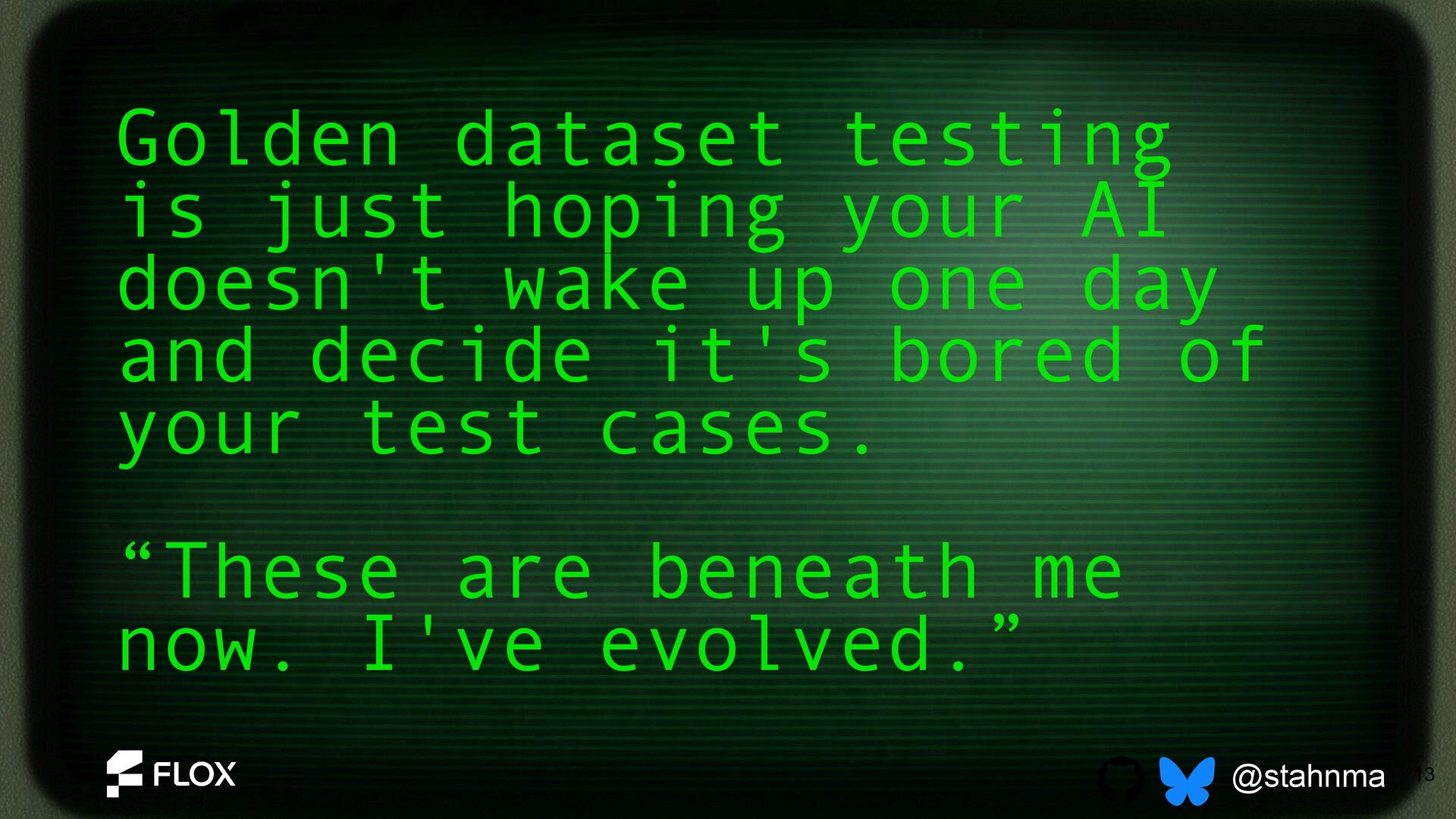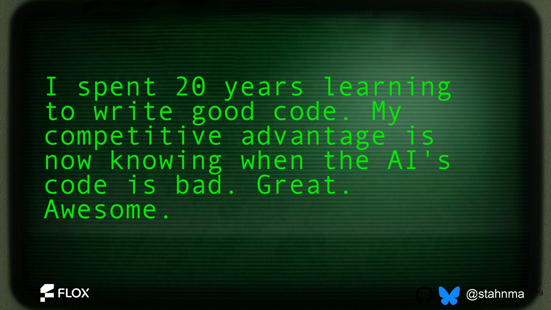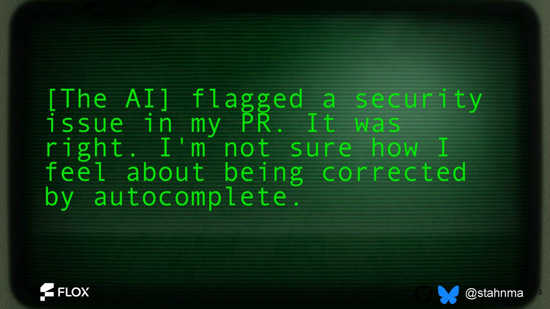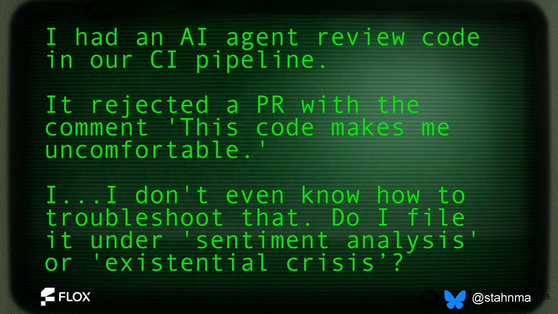 CI pipeline. It rejected a PR with the comment 'This code makes me uncomfortable.' I...I don't even know how to troubleshoot that. Do I file it under 'sentiment analysis' or 'existential crisis’? @stahnma