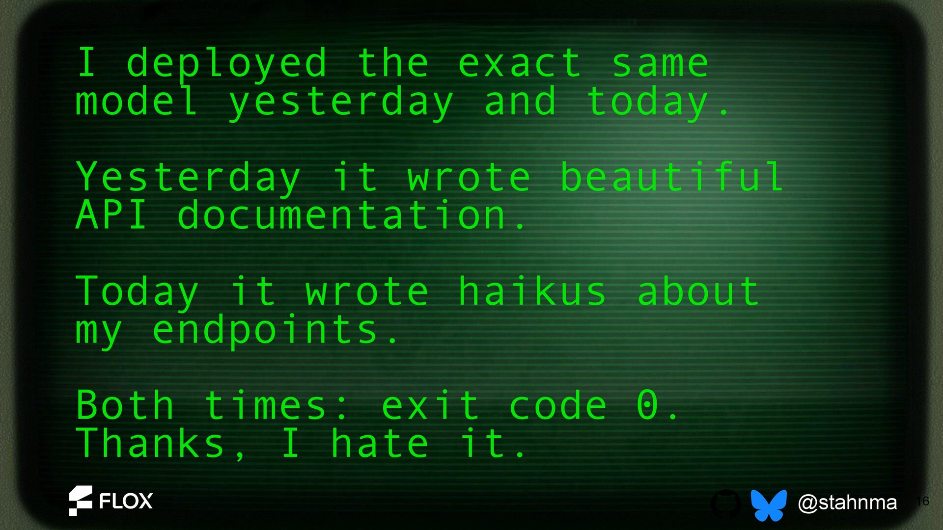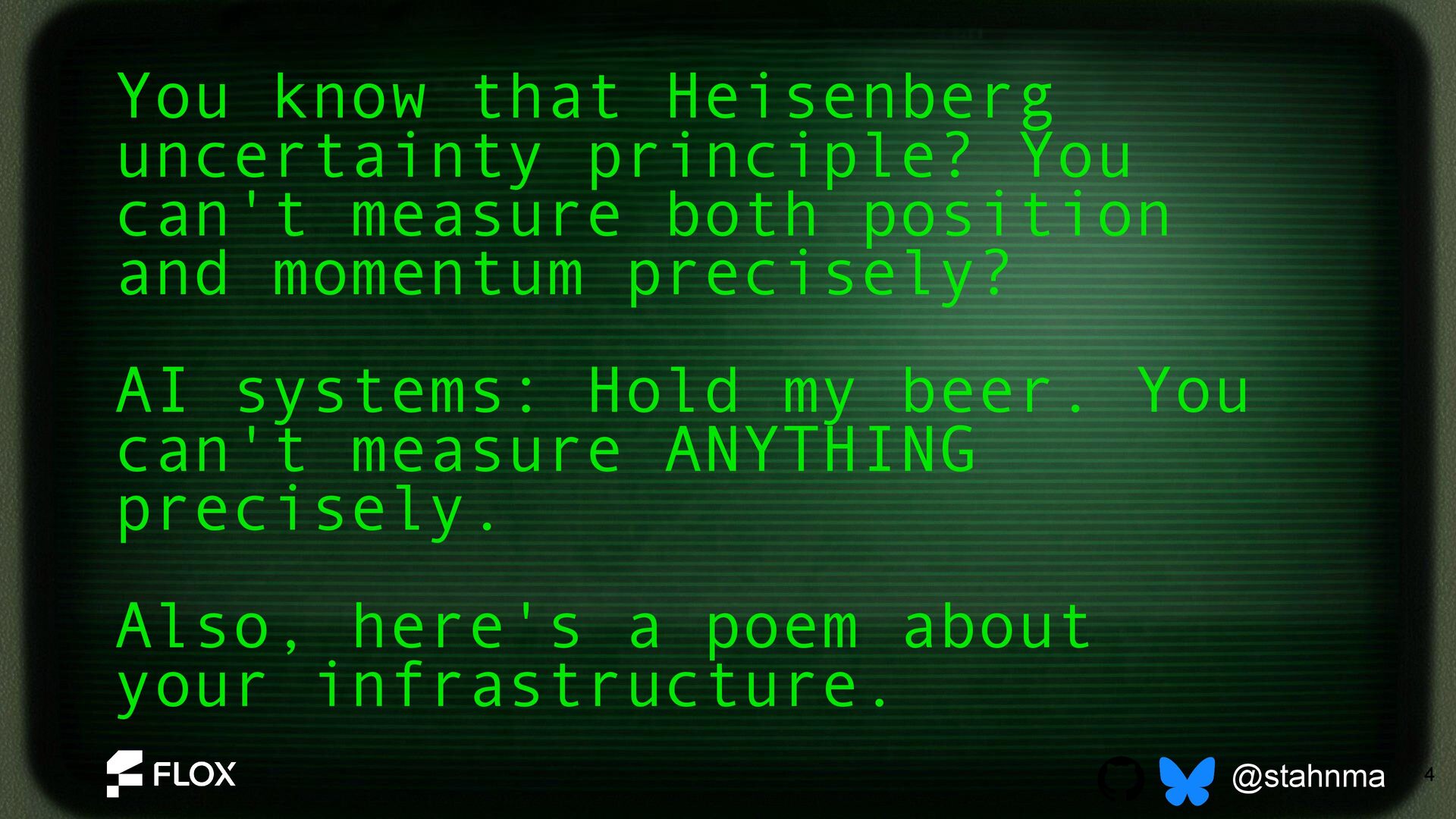 both position and momentum precisely? AI systems: Hold my beer. You can't measure ANYTHING precisely. Also, here's a poem about your infrastructure. @stahnma