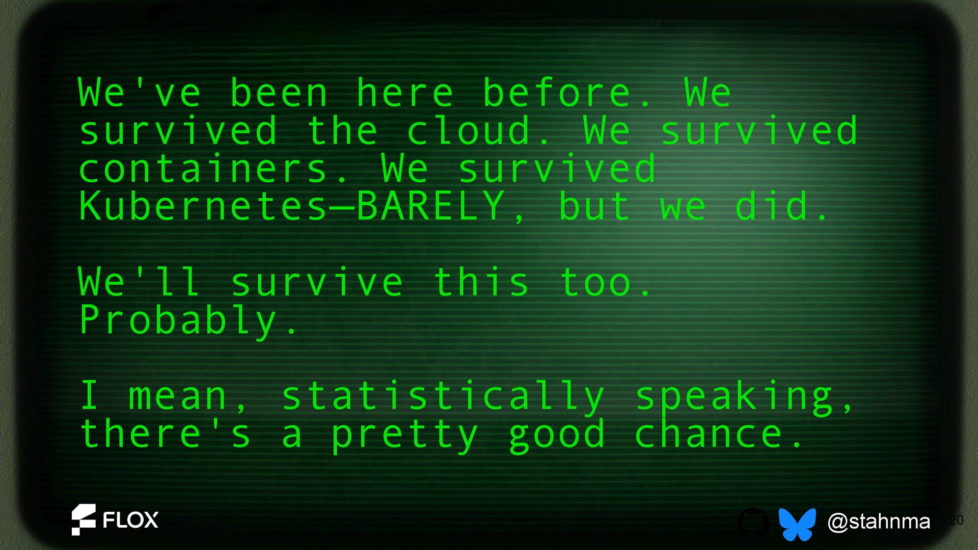 survived containers. We survived Kubernetes—BARELY, but we did. We'll survive this too. Probably. I mean, statistically speaking, there's a pretty good chance. @stahnma