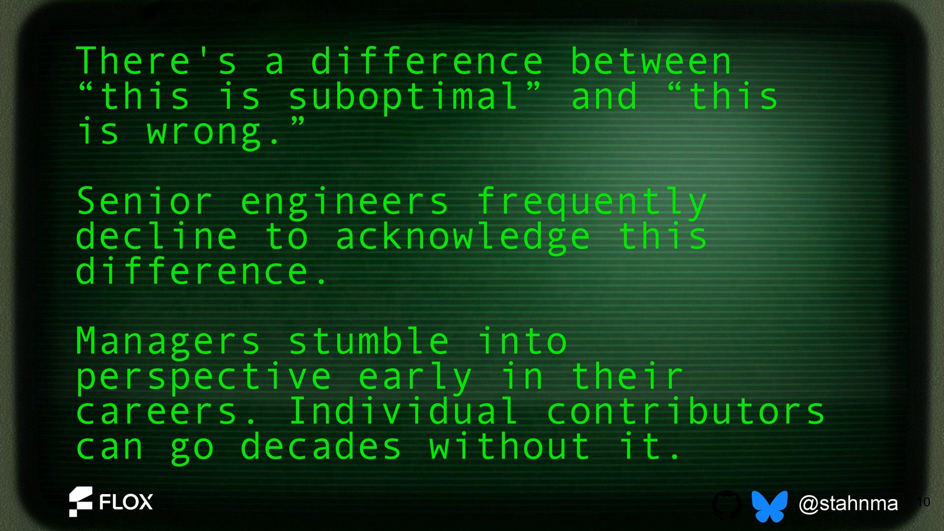 is wrong.” Senior engineers frequently decline to acknowledge this difference. Managers stumble into perspective early in their careers. Individual contributors can go decades without it. @stahnma