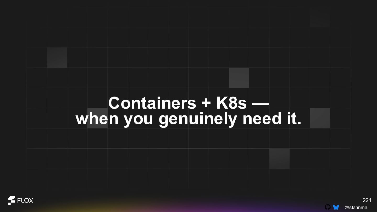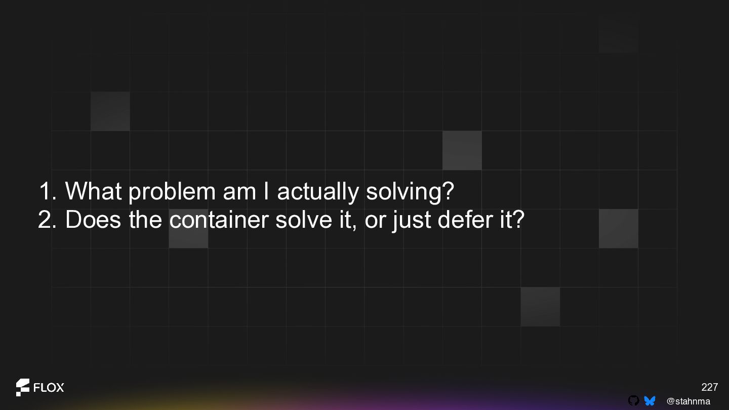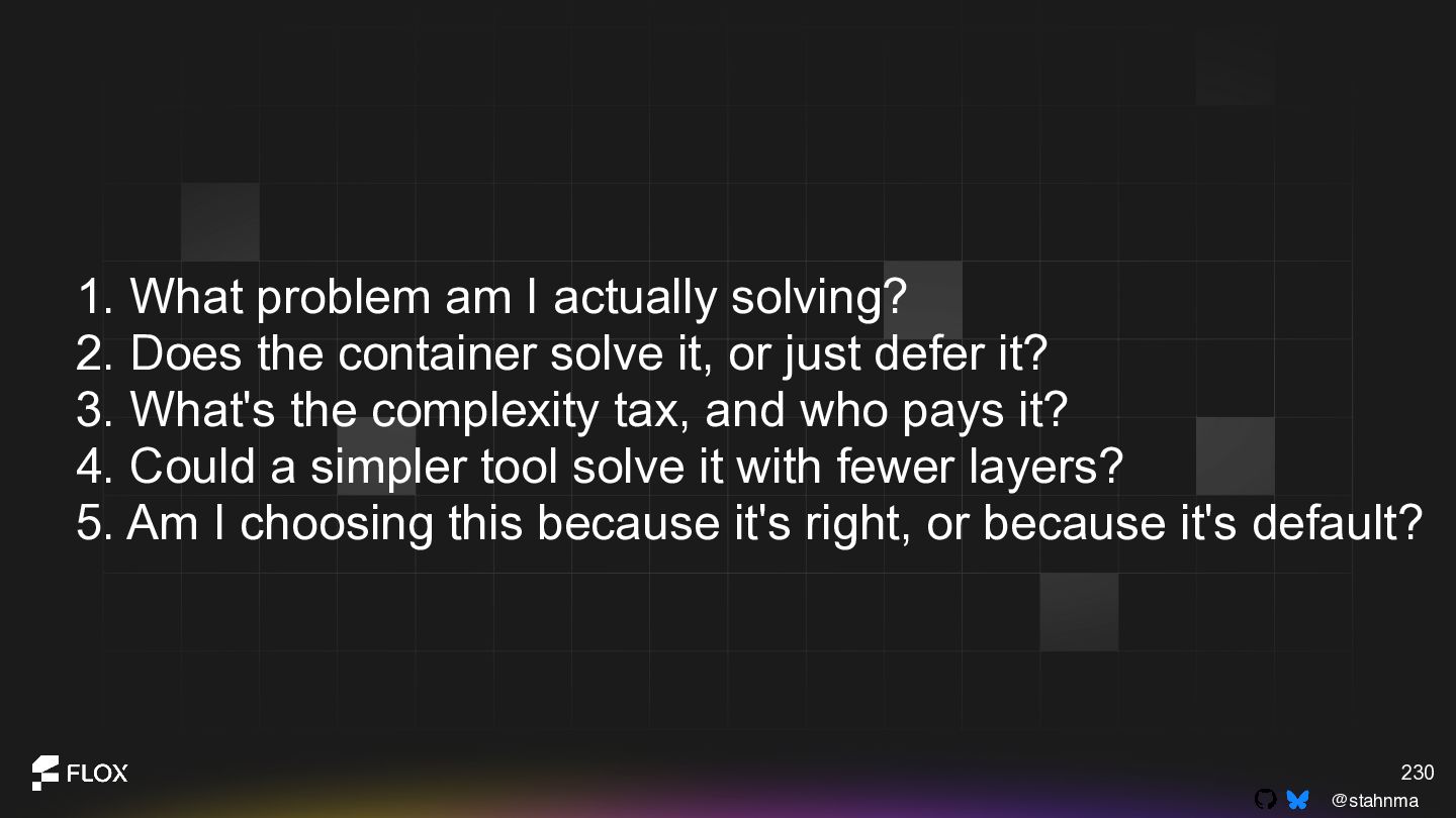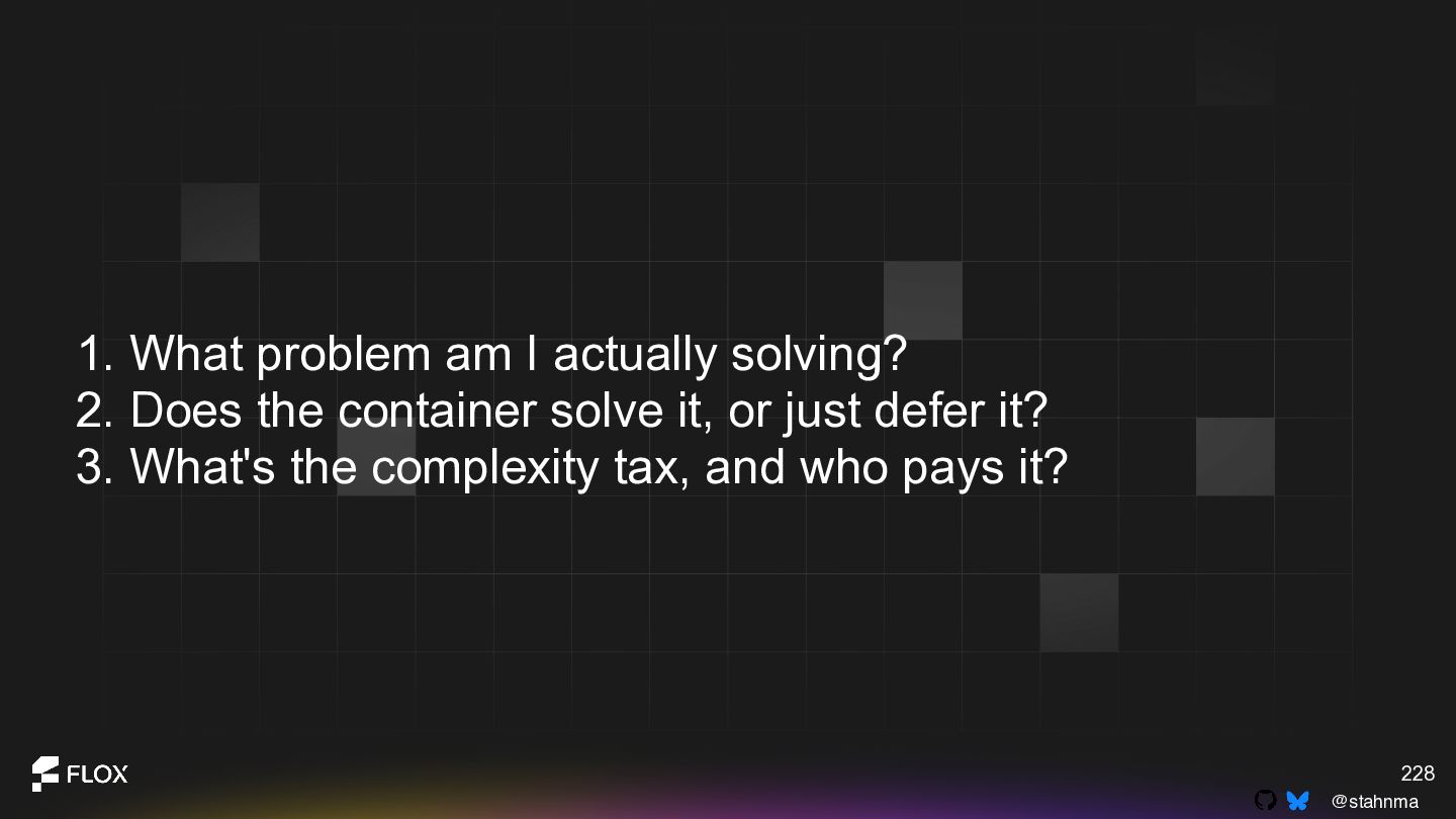 This is not an anti-container talk. It is an invitation to reexamine long-standing assumptions with the experience we have now. Attendees will walk away with a practical framework for deciding when containers are genuinely the best choice, when alternative patterns might reduce cognitive or operational overhead, and how to have healthy, blame-free conversations about technical change within their teams.