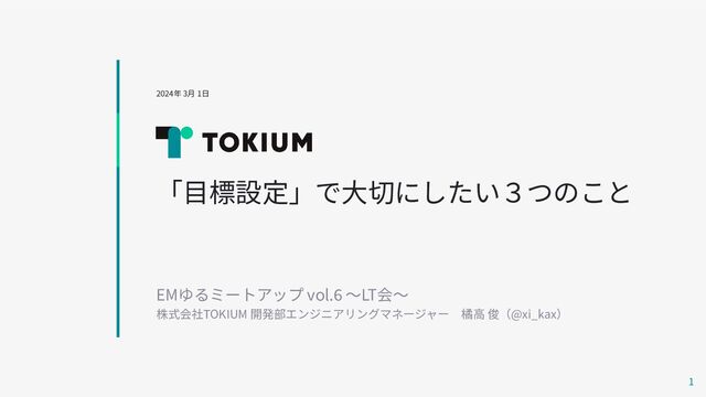 「⽬標設定」で⼤切にしたい3つのこと 1 2024年 3⽉ 1⽇ EMゆるミートアップ vol.6 〜LT会〜 株式会社TOKIUM 開発部エンジニアリングマネージャー 橘⾼