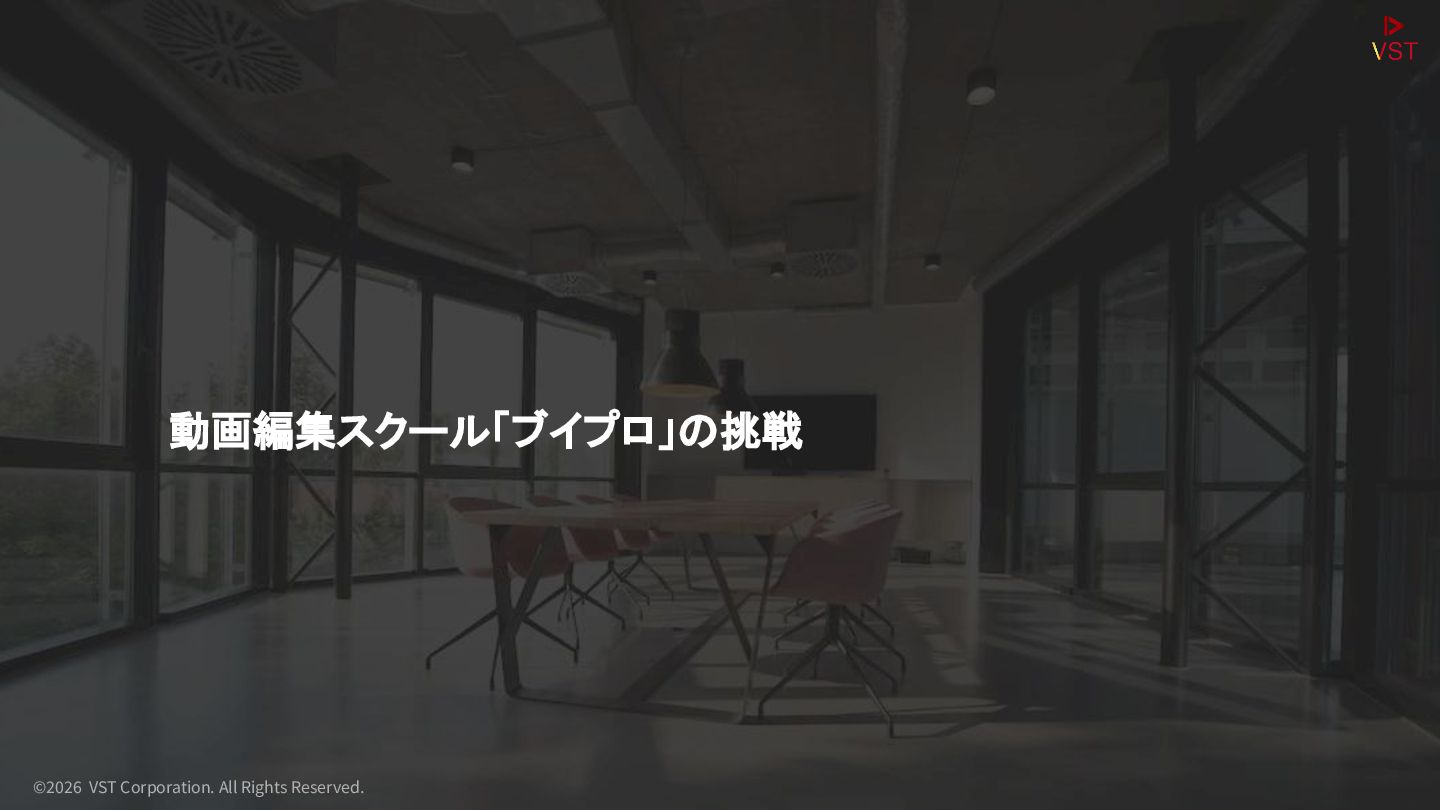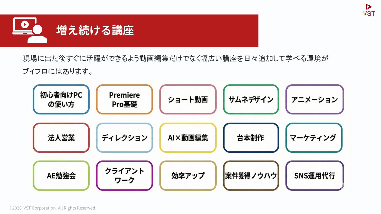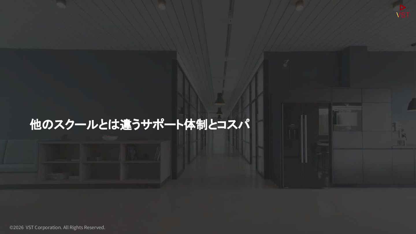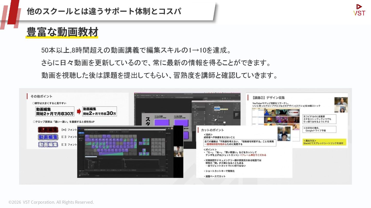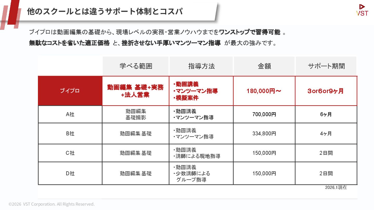 ・模擬案件 180,000円〜 3or6or9ヶ月 A社 動画編集 基礎撮影 ・動画講義 ・マンツーマン指導 700,000円 6ヶ月 B社 動画編集 基礎 ・動画講義 ・マンツーマン指導 334,800円 4ヶ月 C社 動画編集 基礎 ・動画講義 ・講師による現地指導 150,000円 2日間 D社 動画編集 基礎 ・動画講義 ・少数講師による グループ指導 150,000円 2日間 2026.1現在 ブイプロは動画編集の基礎から、現場レベルの実務・営業ノウハウまでをワンストップで習得可能 。 無駄なコストを省いた適正価格 と、挫折させない手厚いマンツーマン指導 が最大の強みです。 他のスクールとは違うサポート体制とコスパ ©2026 VST Corporation. All Rights Reserved.