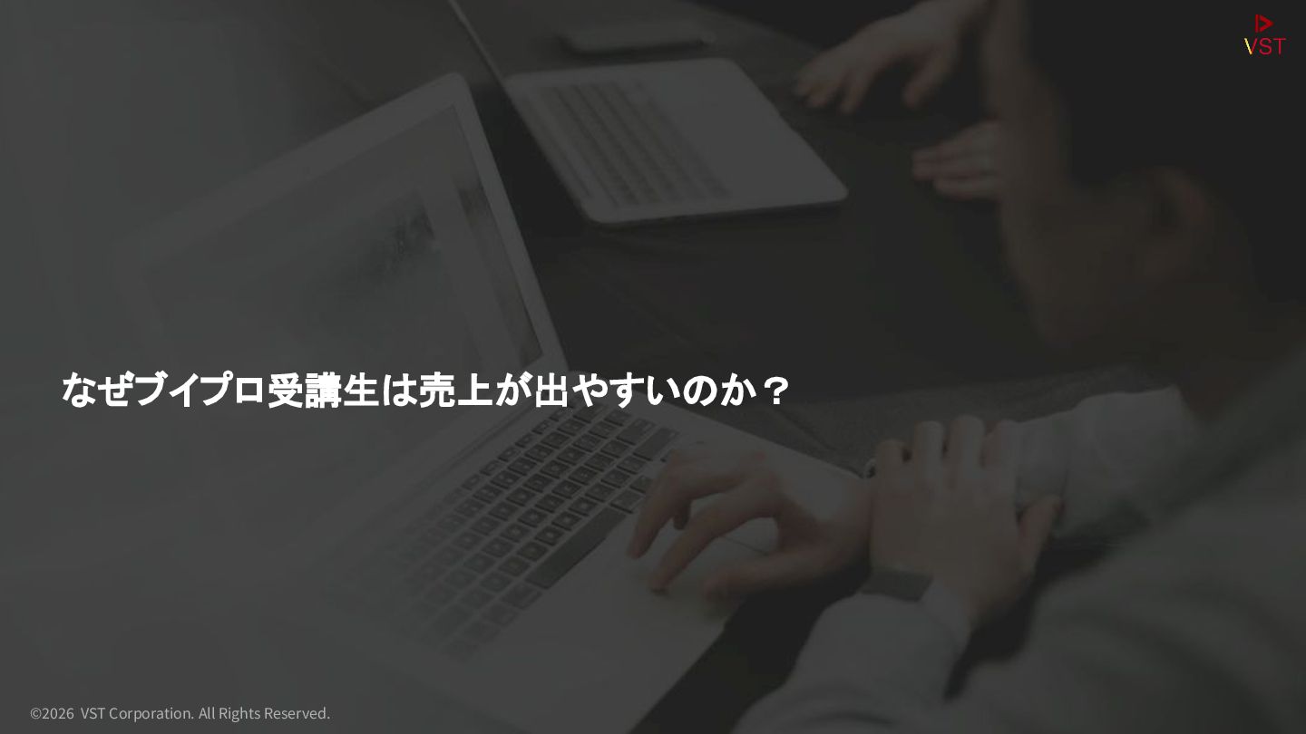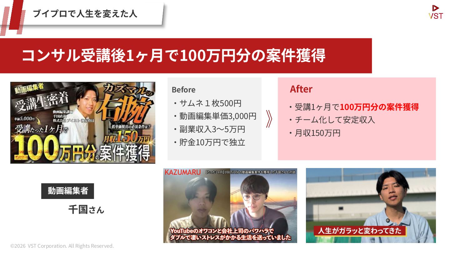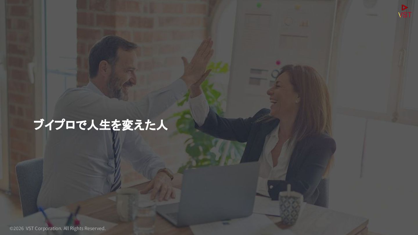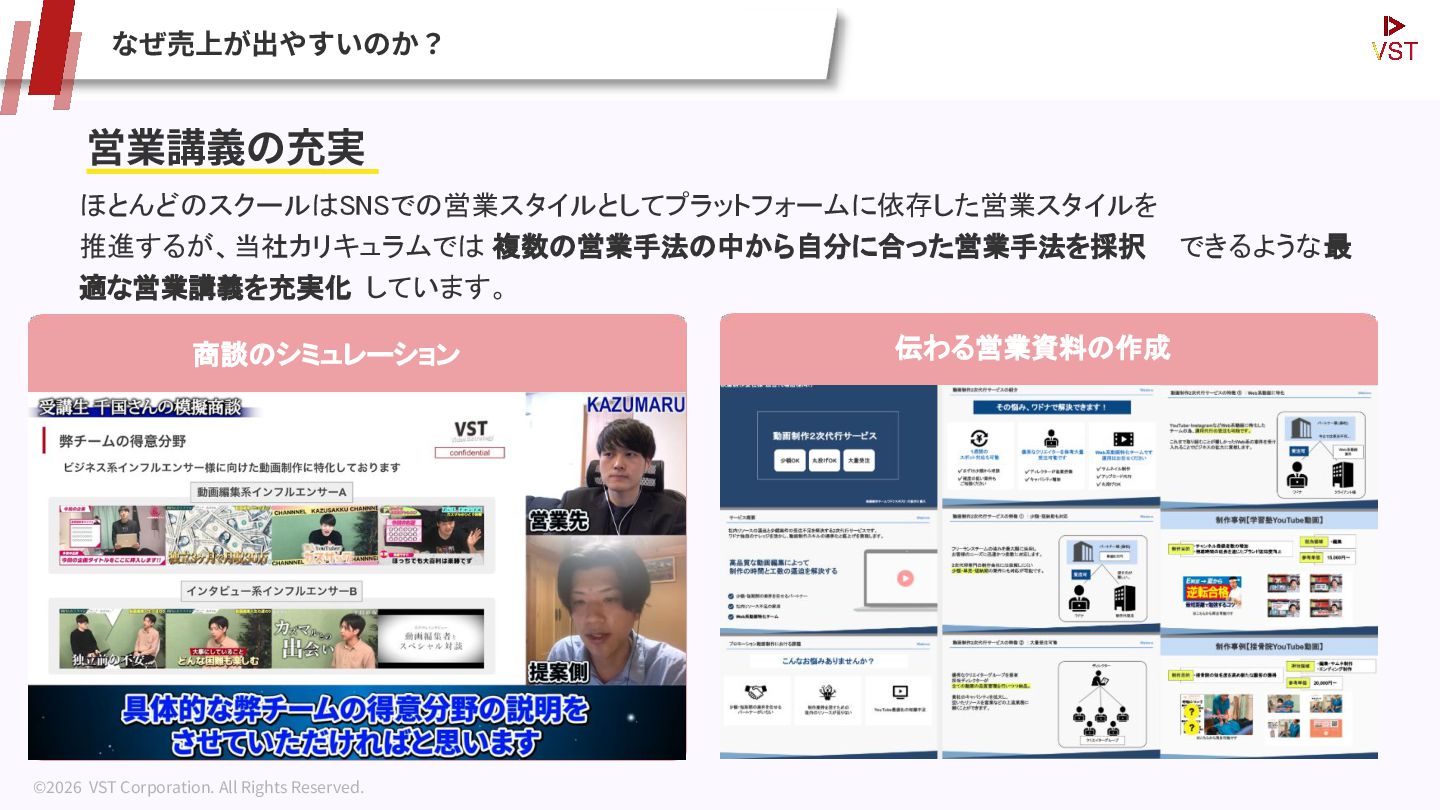 ・模擬案件 180,000円〜 3or6or9ヶ月 A社 動画編集 基礎撮影 ・動画講義 ・マンツーマン指導 700,000円 6ヶ月 B社 動画編集 基礎 ・動画講義 ・マンツーマン指導 334,800円 4ヶ月 C社 動画編集 基礎 ・動画講義 ・講師による現地指導 150,000円 2日間 D社 動画編集 基礎 ・動画講義 ・少数講師による グループ指導 150,000円 2日間 2026.1現在 ブイプロは動画編集の基礎から、現場レベルの実務・営業ノウハウまでをワンストップで習得可能 。 無駄なコストを省いた適正価格 と、挫折させない手厚いマンツーマン指導 が最大の強みです。 他のスクールとは違うサポート体制とコスパ ©2026 VST Corporation. All Rights Reserved.