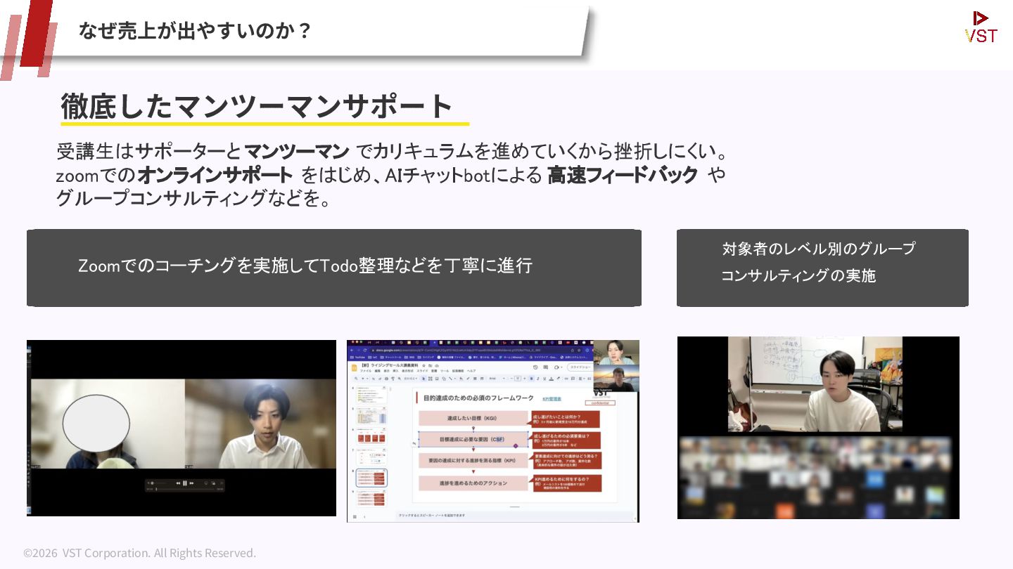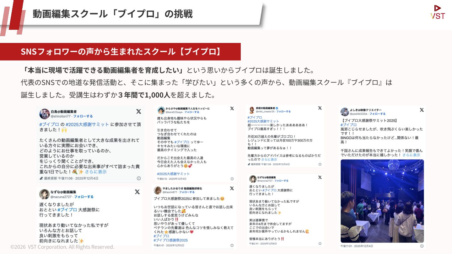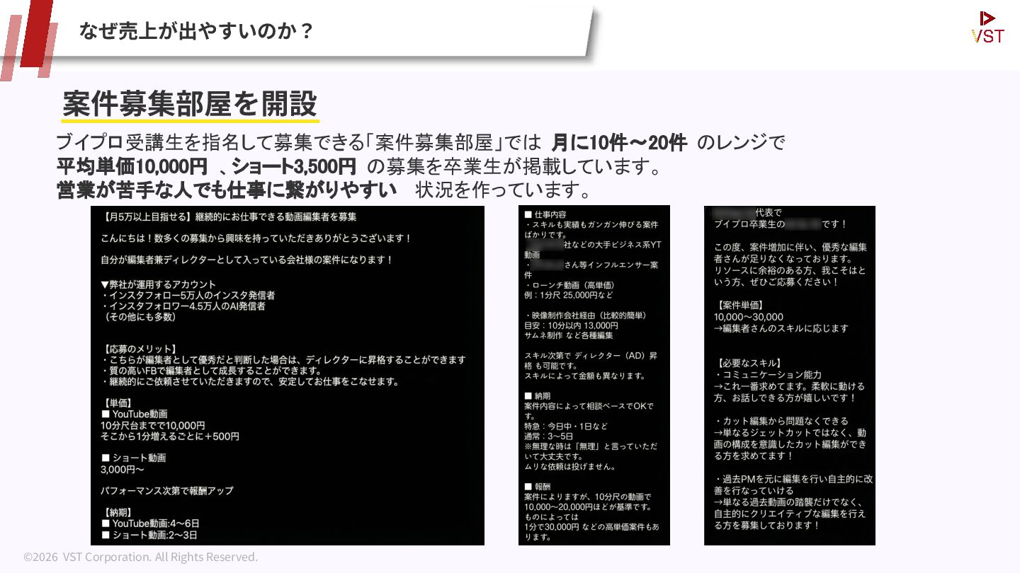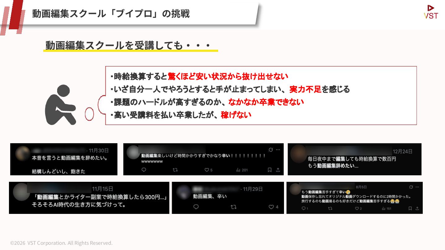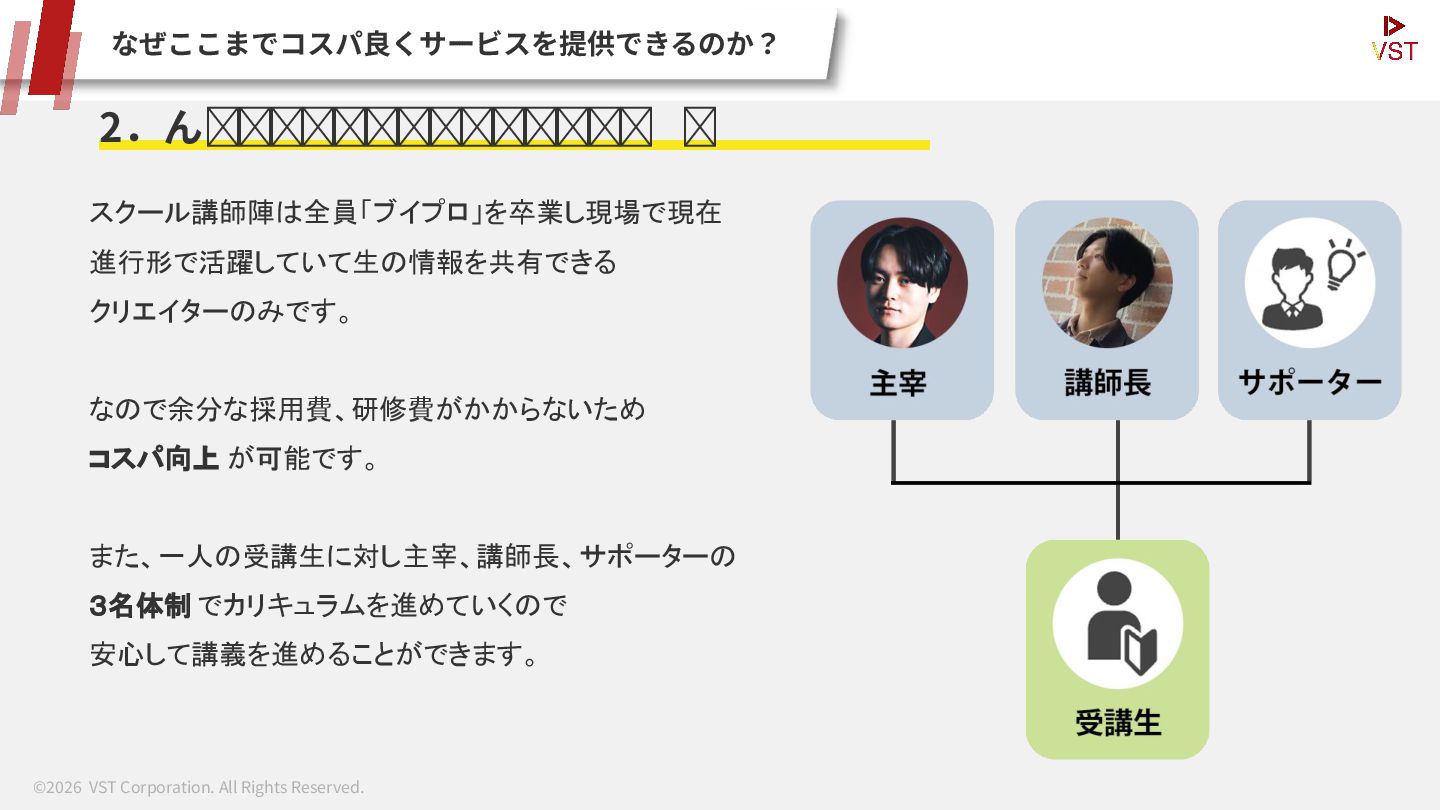 ・模擬案件 180,000円〜 3or6or9ヶ月 A社 動画編集 基礎撮影 ・動画講義 ・マンツーマン指導 700,000円 6ヶ月 B社 動画編集 基礎 ・動画講義 ・マンツーマン指導 334,800円 4ヶ月 C社 動画編集 基礎 ・動画講義 ・講師による現地指導 150,000円 2日間 D社 動画編集 基礎 ・動画講義 ・少数講師による グループ指導 150,000円 2日間 2026.1現在 ブイプロは動画編集の基礎から、現場レベルの実務・営業ノウハウまでをワンストップで習得可能 。 無駄なコストを省いた適正価格 と、挫折させない手厚いマンツーマン指導 が最大の強みです。 他のスクールとは違うサポート体制とコスパ ©2026 VST Corporation. All Rights Reserved.