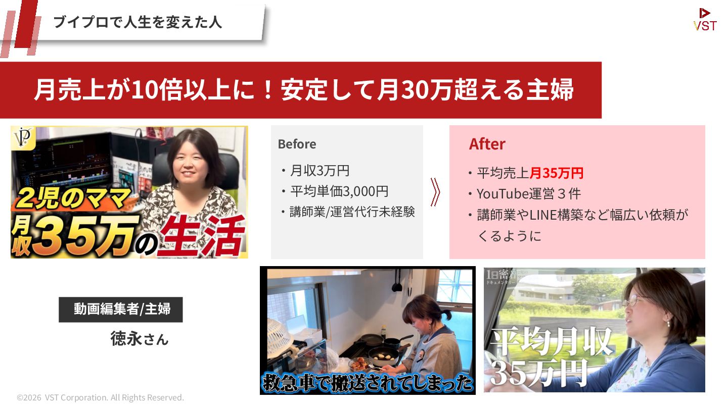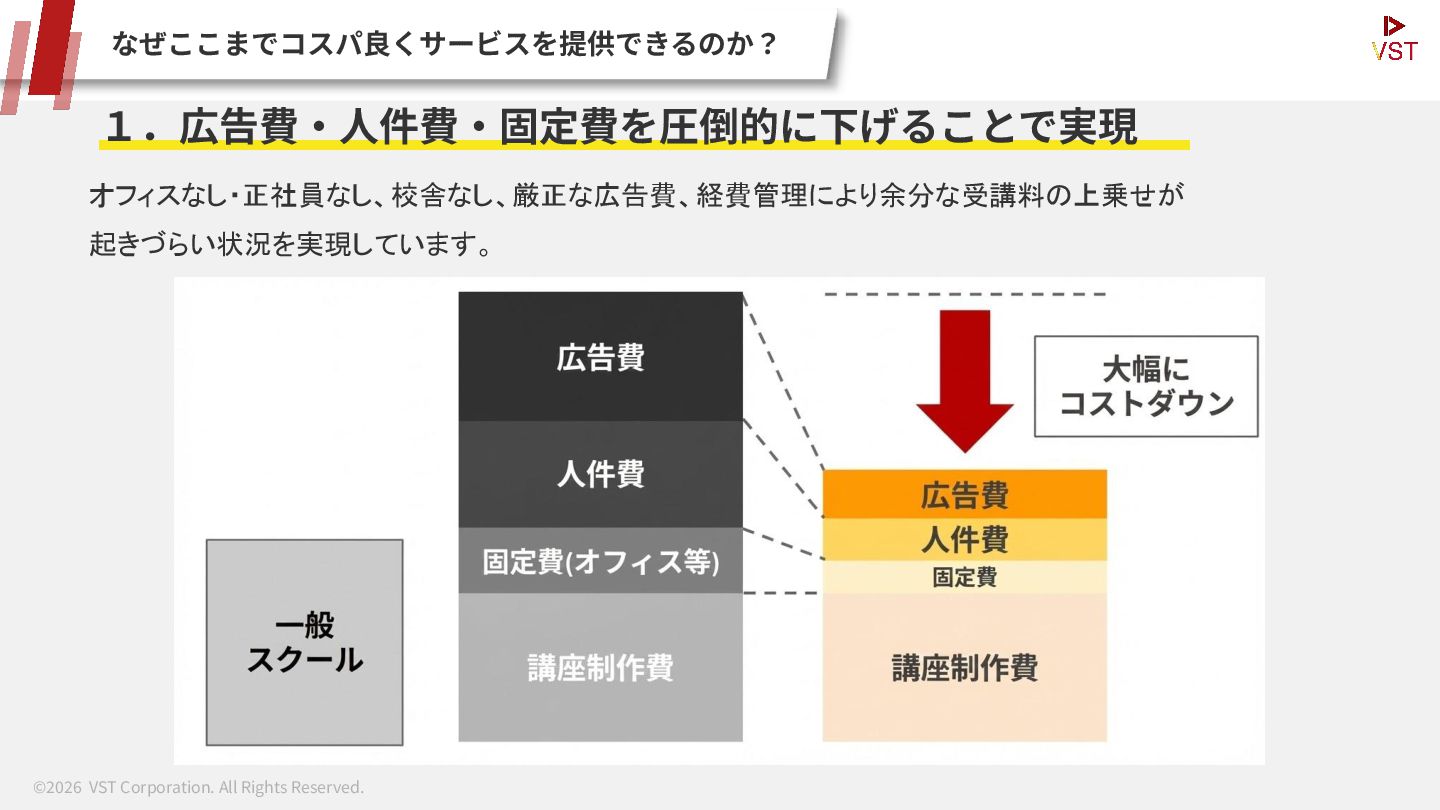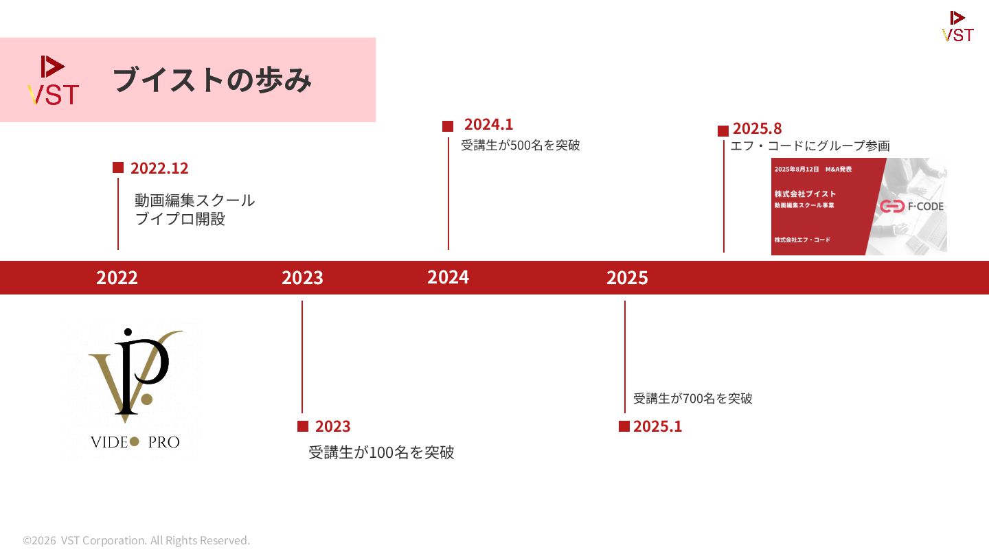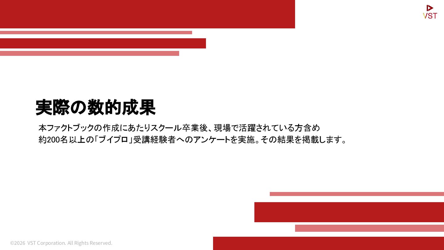 ・模擬案件 180,000円〜 3or6or9ヶ月 A社 動画編集 基礎撮影 ・動画講義 ・マンツーマン指導 700,000円 6ヶ月 B社 動画編集 基礎 ・動画講義 ・マンツーマン指導 334,800円 4ヶ月 C社 動画編集 基礎 ・動画講義 ・講師による現地指導 150,000円 2日間 D社 動画編集 基礎 ・動画講義 ・少数講師による グループ指導 150,000円 2日間 2026.1現在 ブイプロは動画編集の基礎から、現場レベルの実務・営業ノウハウまでをワンストップで習得可能 。 無駄なコストを省いた適正価格 と、挫折させない手厚いマンツーマン指導 が最大の強みです。 他のスクールとは違うサポート体制とコスパ ©2026 VST Corporation. All Rights Reserved.