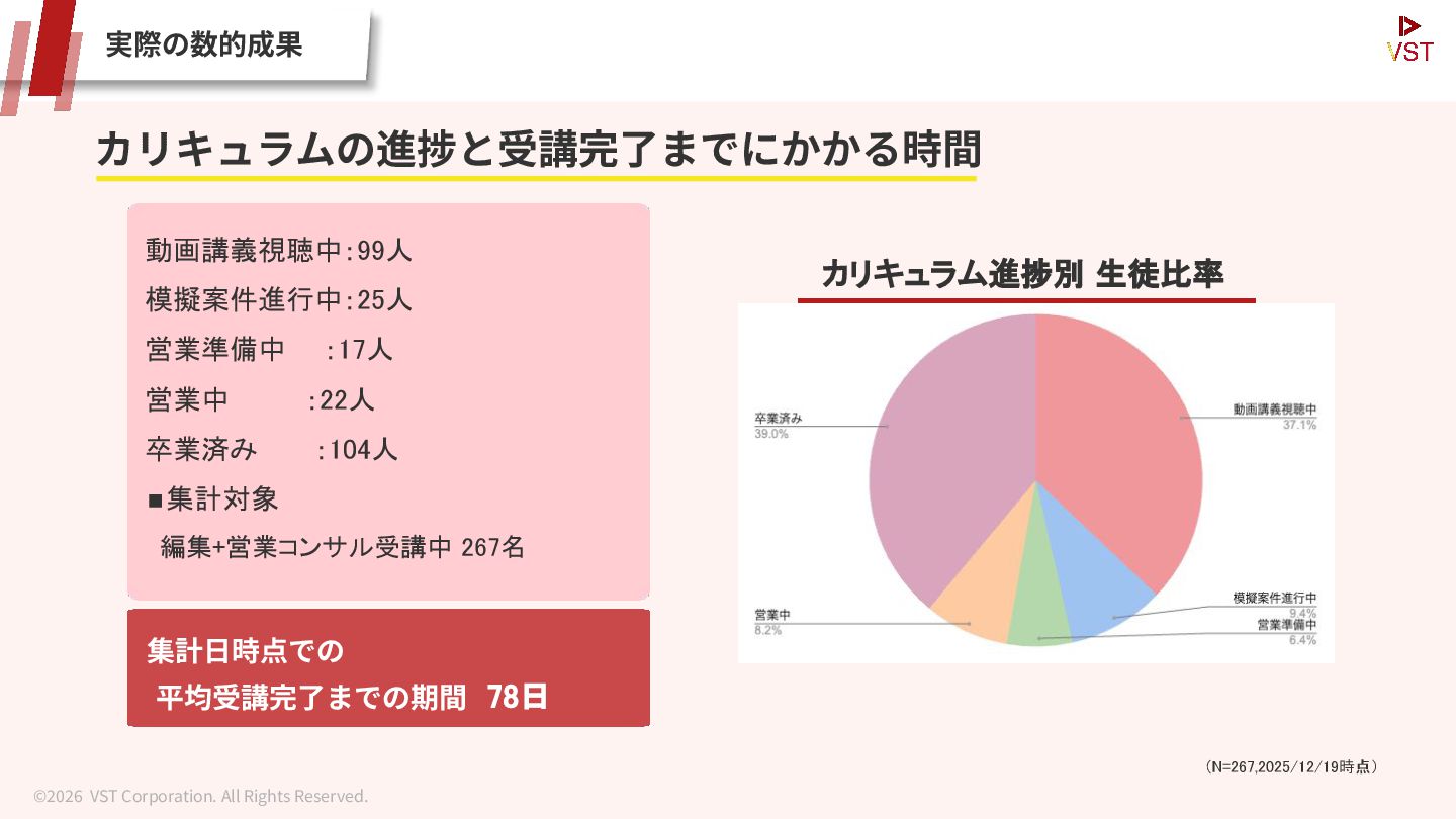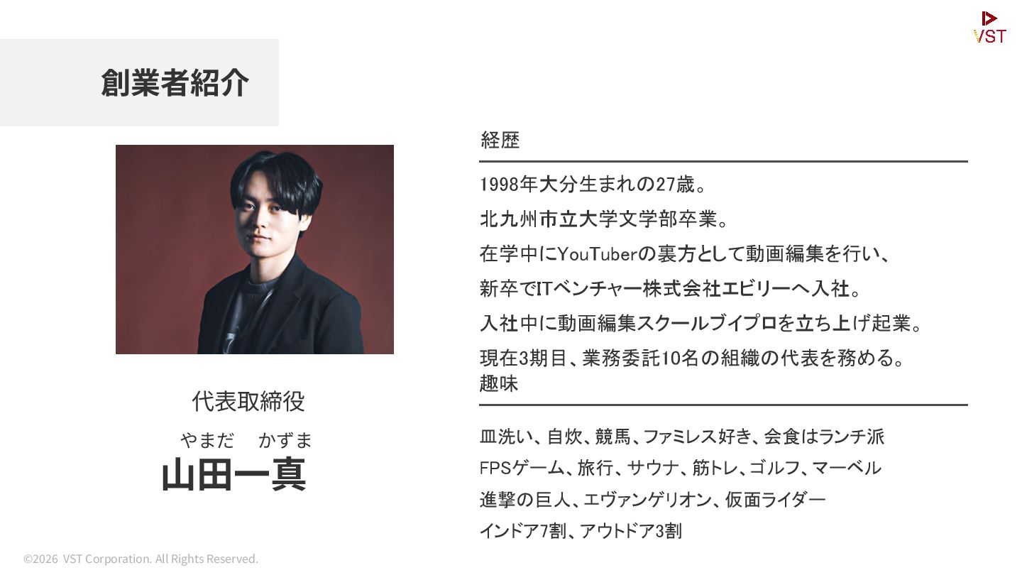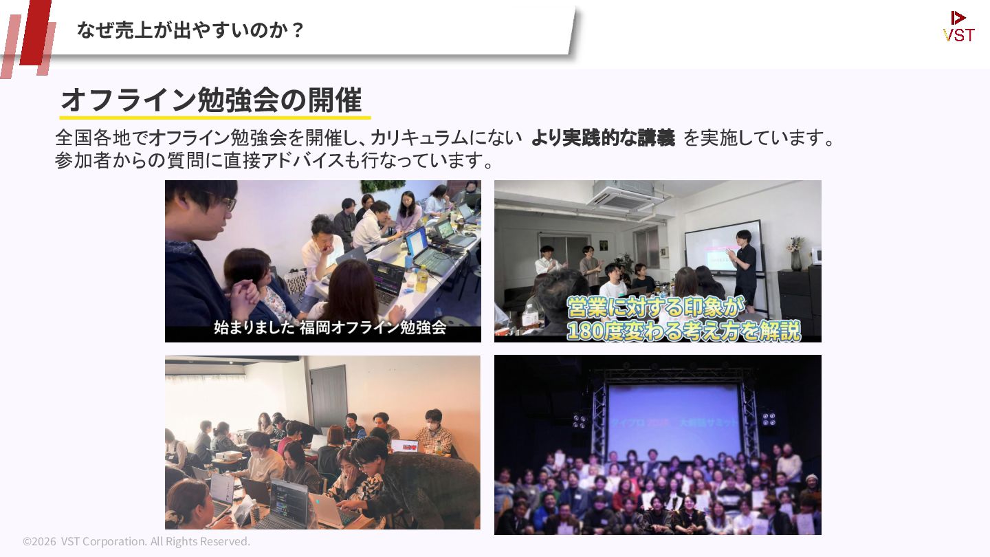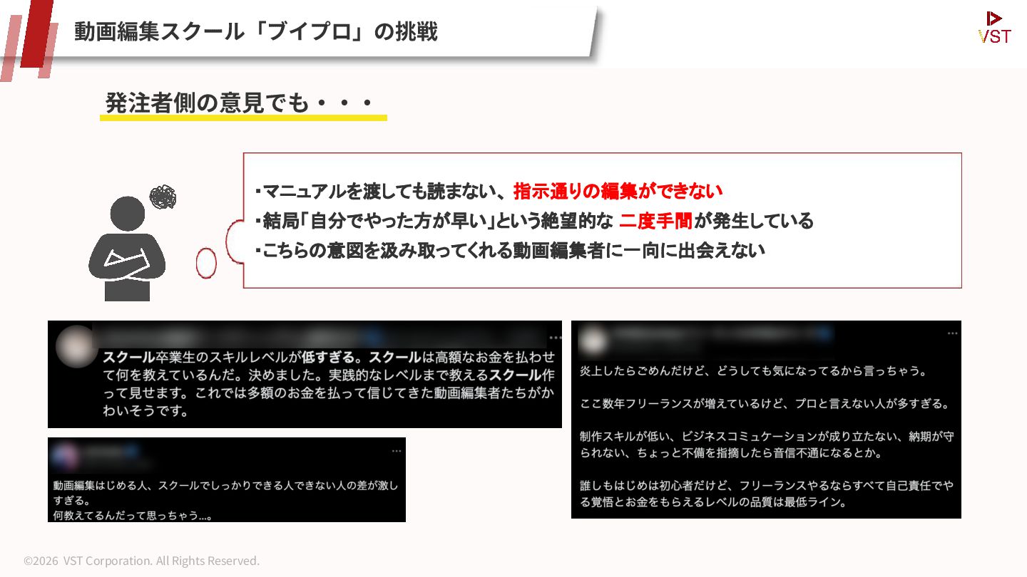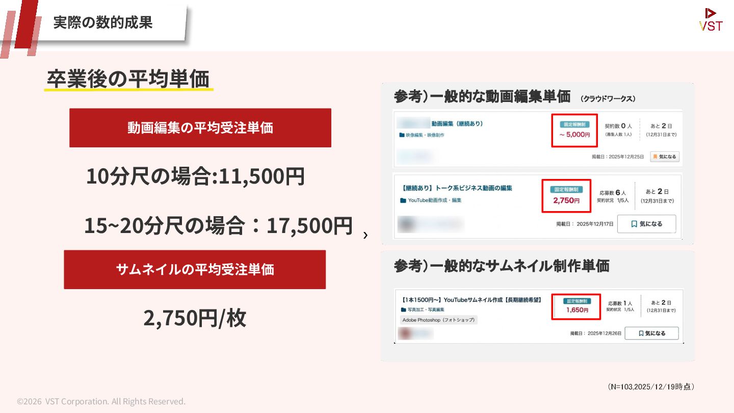 ・模擬案件 180,000円〜 3or6or9ヶ月 A社 動画編集 基礎撮影 ・動画講義 ・マンツーマン指導 700,000円 6ヶ月 B社 動画編集 基礎 ・動画講義 ・マンツーマン指導 334,800円 4ヶ月 C社 動画編集 基礎 ・動画講義 ・講師による現地指導 150,000円 2日間 D社 動画編集 基礎 ・動画講義 ・少数講師による グループ指導 150,000円 2日間 2026.1現在 ブイプロは動画編集の基礎から、現場レベルの実務・営業ノウハウまでをワンストップで習得可能 。 無駄なコストを省いた適正価格 と、挫折させない手厚いマンツーマン指導 が最大の強みです。 他のスクールとは違うサポート体制とコスパ ©2026 VST Corporation. All Rights Reserved.