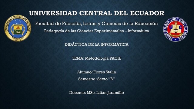 de la Educación Pedagogía de las Ciencias Experimentales – Informática DIDÁCTICA DE LA INFORMÁTICA TEMA: Metodología PACIE Alumno: Flores Stalin Semestre: Sexto “B” Docente: MSc. Lilian Jaramillo