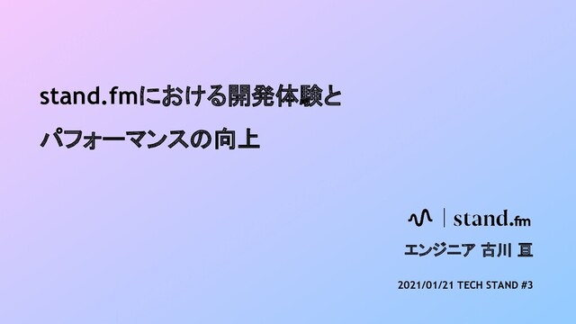 stand.fmにおける開発体験と パフォーマンスの向上 エンジニア 古川 亘 2021/01/21 TECH STAND #3