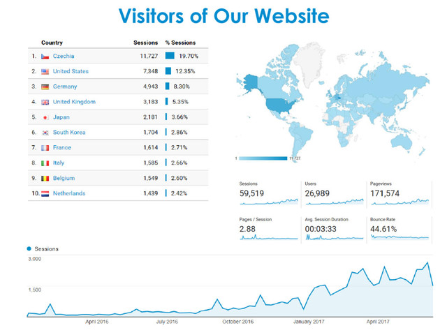 54 52 48 45 45 34 33 29 25 23 23 21 0 30 60 90 120 150 180 210 Czech Republic Germany USA United Kingdom France Switzerland Japan Hungary Belgium Italy Netherlands Korea China Austria Poland Denmark Sweden Spain 16 16 13 13 12 10 10 7 6 6 5 5 5 5 5 3 3 3 3 3 0 5 10 15 Canada Russia Brazil Taiwan Turkey Ireland Slovakia Australia Latvia Serbia Finland Chile Israel Norway Portugal Argentina India Romania Thailand Ukraine 2 2 2 2 2 2 2 2 2 2 1 1 1 1 1 1 1 0 1 2 Armenia Estonia Ghana Greece Hong Kong Macedonia New Zealand Singapore Slovenia South Africa Côte d'Ivoire Egypt Georgia Iran Mexico Qatar Uruguay 1301 + 53 onsite registrations = 1354 participants in total