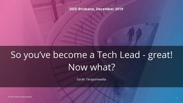 In this presentation, which was presented to DDD Brisbane in December 2019, you will hear/see how Sarah has helped many upcoming Senior Engineers transition into successful Tech Leads. You will learn more about the expectations of the role and take a look at key attributes for a tech lead. We will dive into the five key capabilities that they need: Custodian of Vision, Project Management, Information Radiator, Mentorship and Productionising the Tech; which are underpinned by Influence Skills, Leadership Styles and Conflict Resolution. If you have been struggling with your new responsibilities, or you are progressing towards this role, this talk is for you.