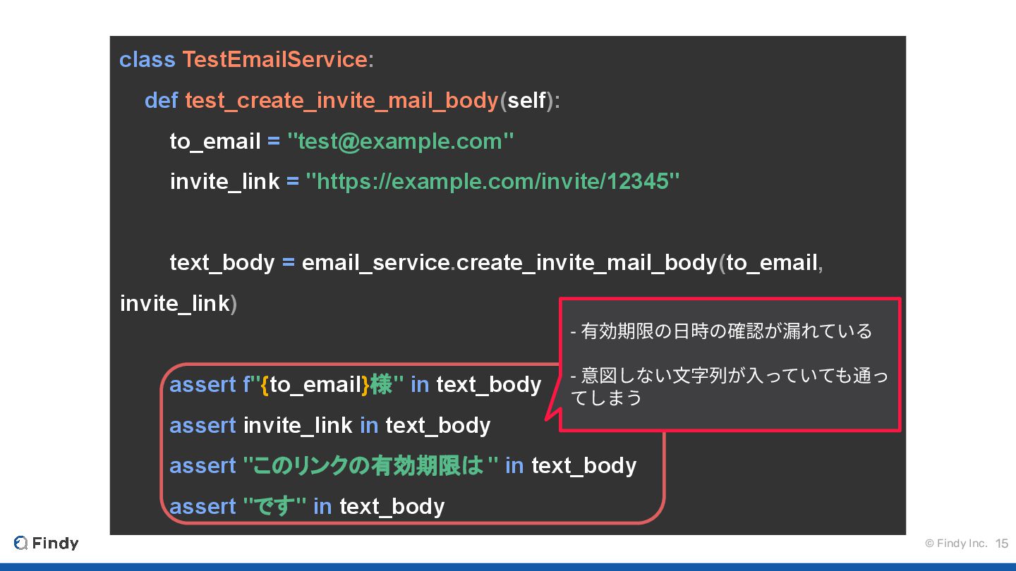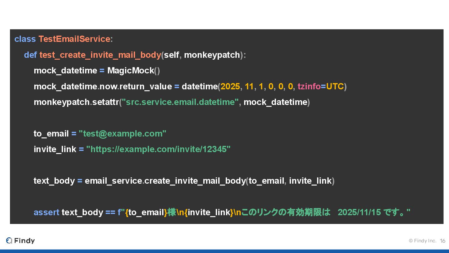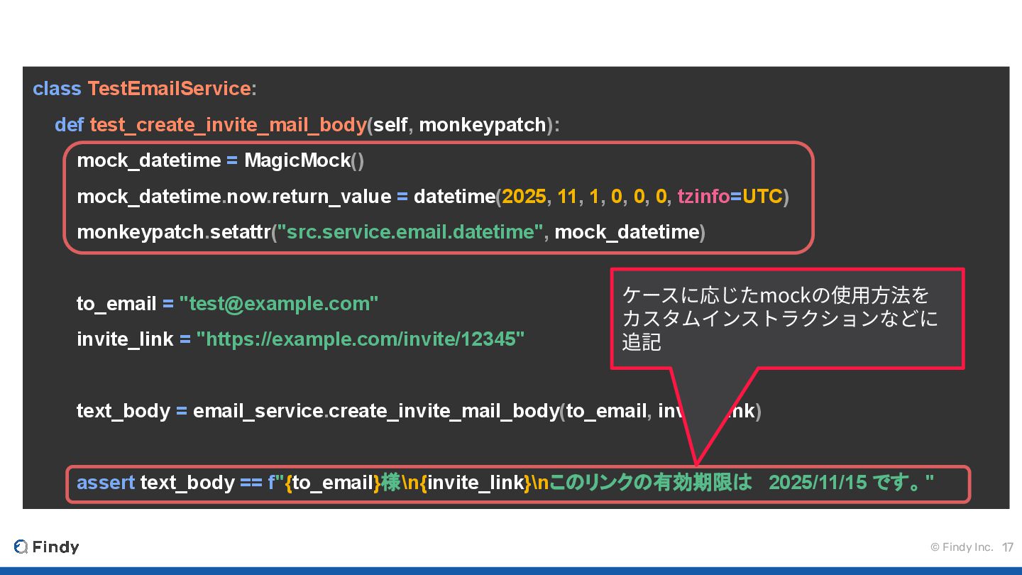 [email protected]" invite_link = "https://example.com/invite/12345" text_body = email_service.create_invite_mail_body(to_email, invite_link) assert text_body == f"{to_email}様\n{invite_link}\nこのリンクの有効期限は 2025/11/15 です。" ケースに応じたmockの使⽤⽅法を カスタムインストラクションなどに 追記