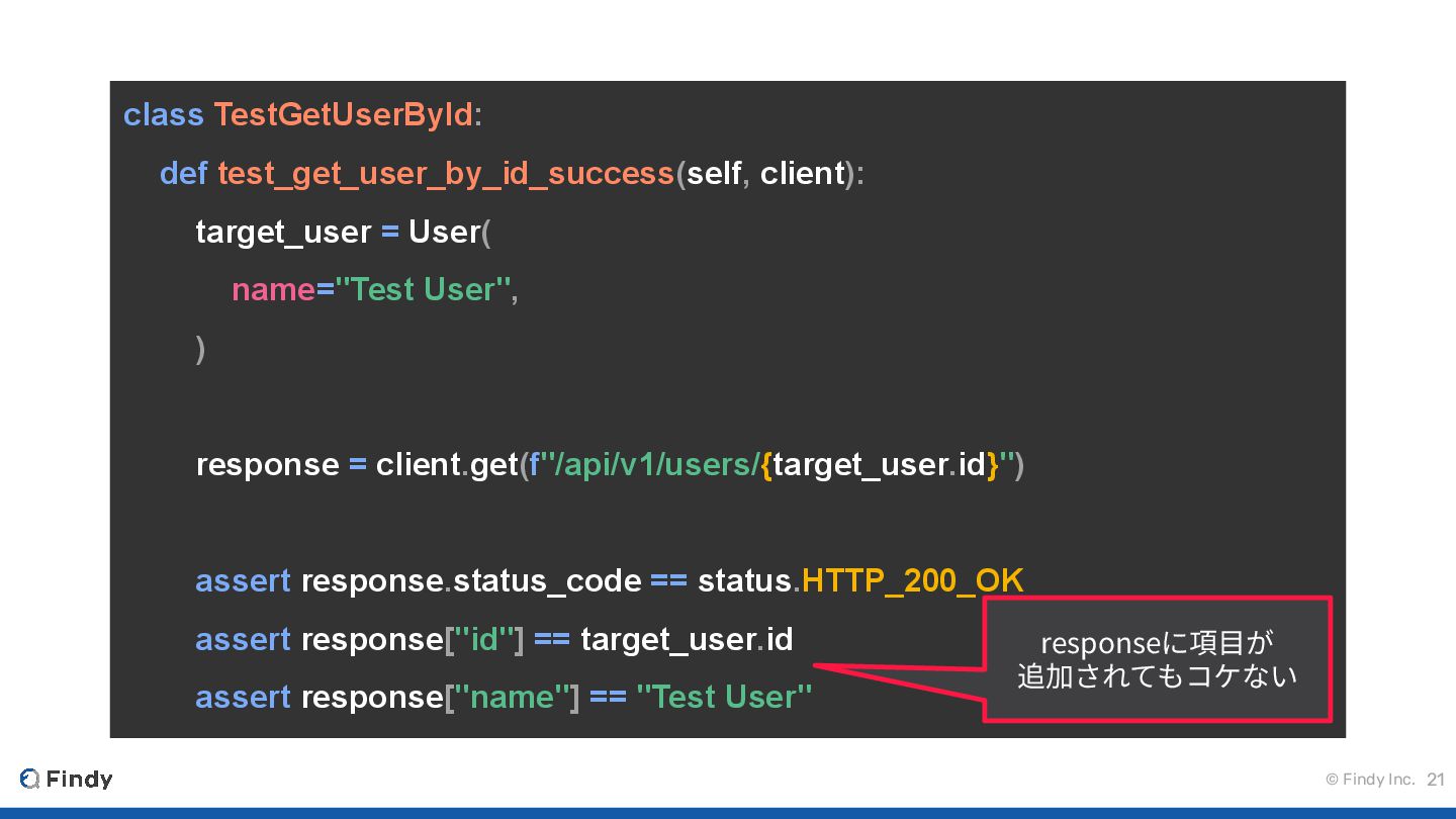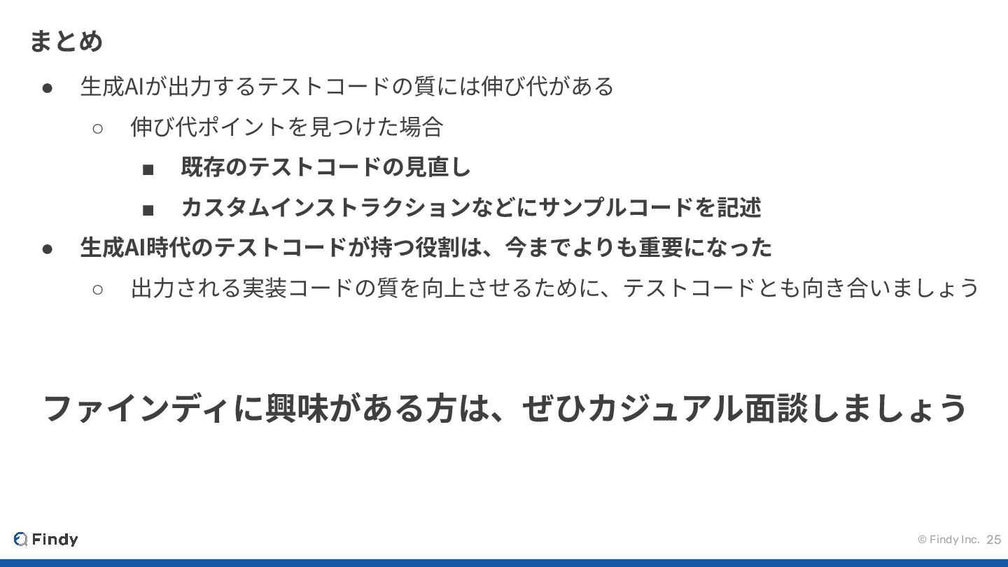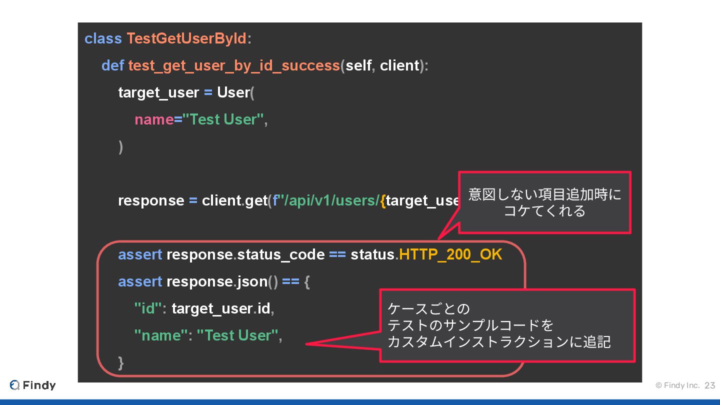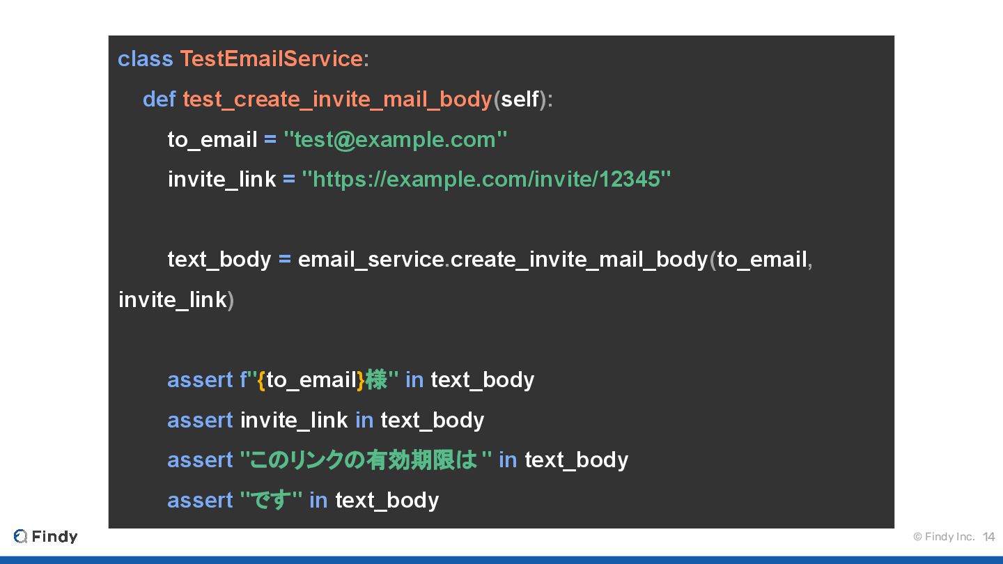 [email protected]" invite_link = "https://example.com/invite/12345" text_body = email_service.create_invite_mail_body(to_email, invite_link) assert text_body == f"{to_email}様\n{invite_link}\nこのリンクの有効期限は 2025/11/15 です。" ケースに応じたmockの使⽤⽅法を カスタムインストラクションなどに 追記