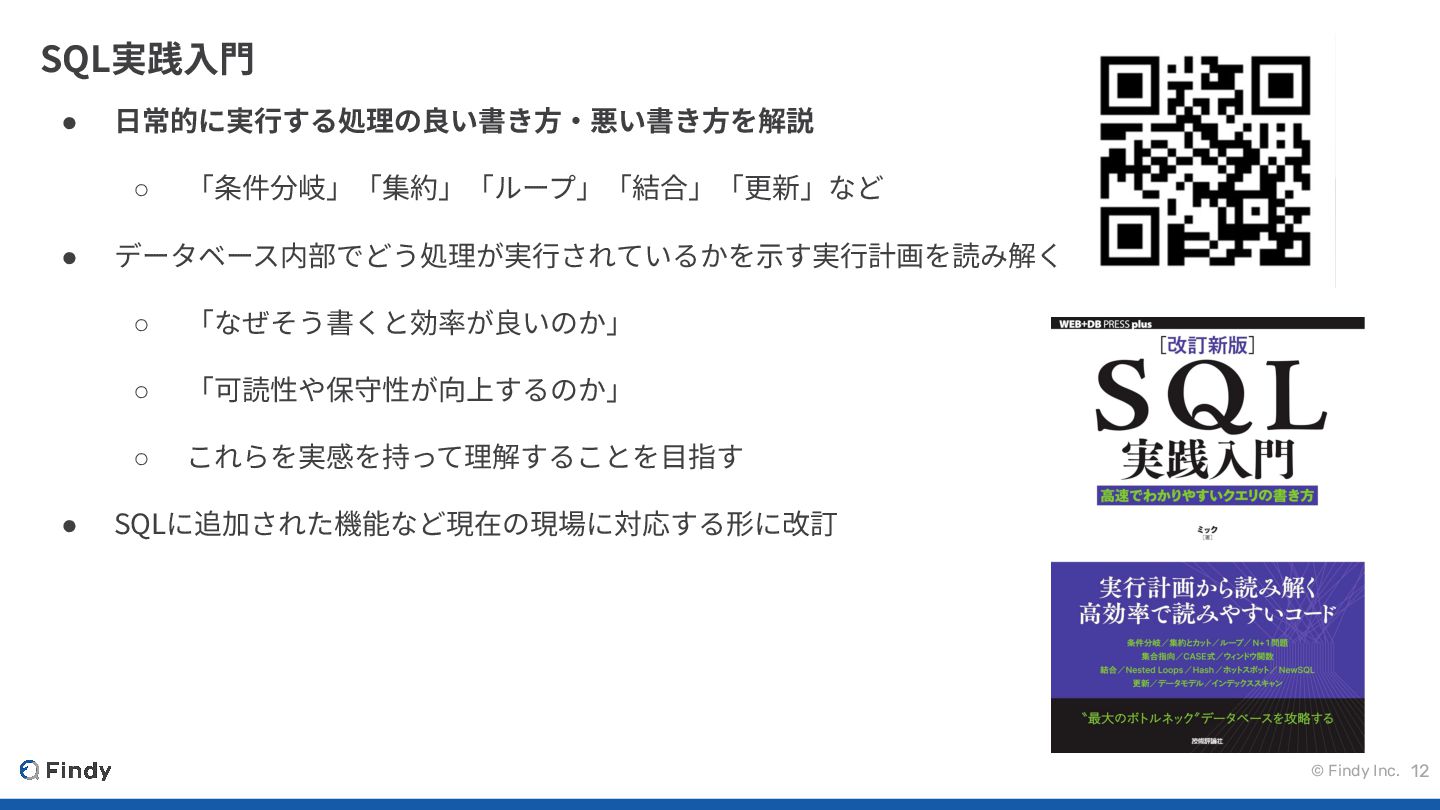 © Findy Inc. 12 SQL実践⼊⾨ • ⽇常的に実⾏する処理の良い書き⽅‧悪い書き⽅を解説 ◦ 「条件分岐」「集約」「ループ」「結合」「更新」など •