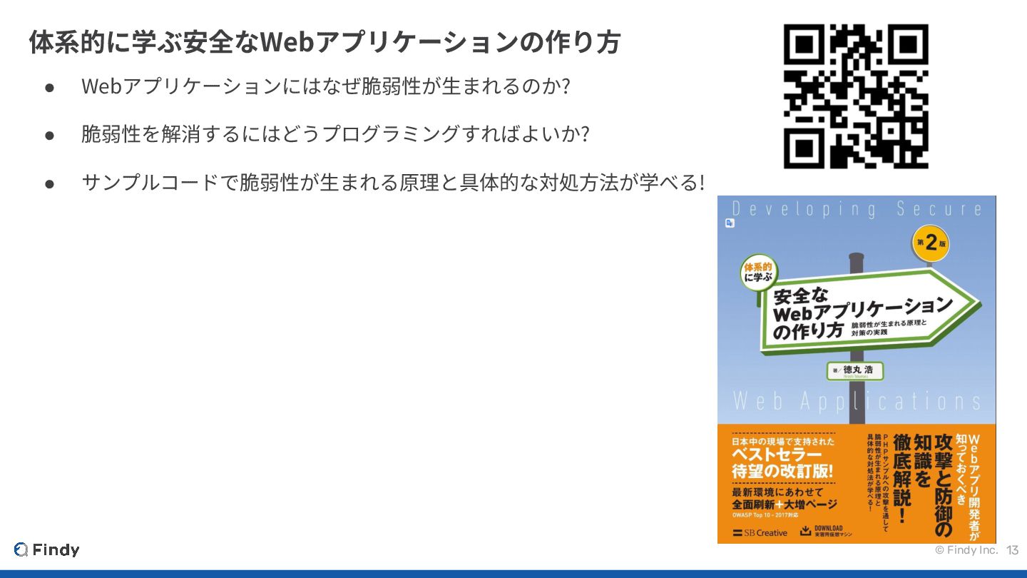 © Findy Inc. 13 体系的に学ぶ安全なWebアプリケーションの作り⽅ • Webアプリケーションにはなぜ脆弱性が⽣まれるのか? • 脆弱性を解消するにはどうプログラミングすればよいか? •