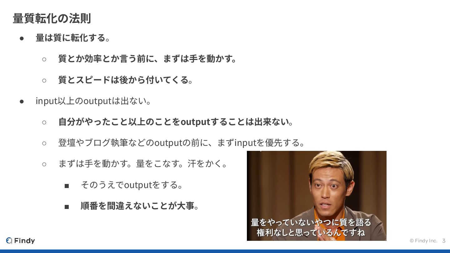 © Findy Inc. 3 量質転化の法則 • 量は質に転化する。 ◦ 質とか効率とか⾔う前に、まずは⼿を動かす。 ◦
