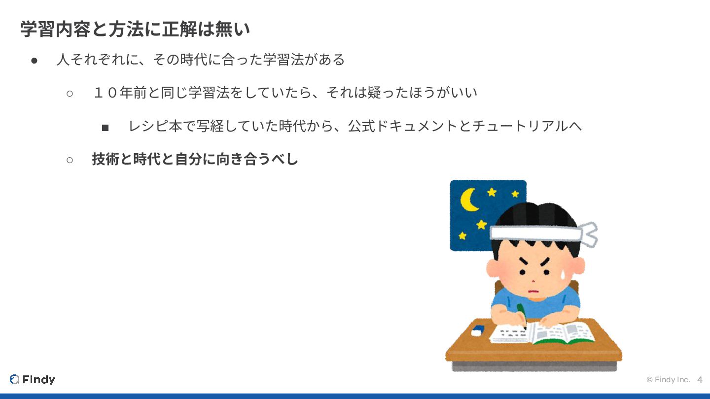 © Findy Inc. 4 学習内容と⽅法に正解は無い • ⼈それぞれに、その時代に合った学習法がある ◦ 10年前と同じ学習法をしていたら、それは疑ったほうがいい ▪