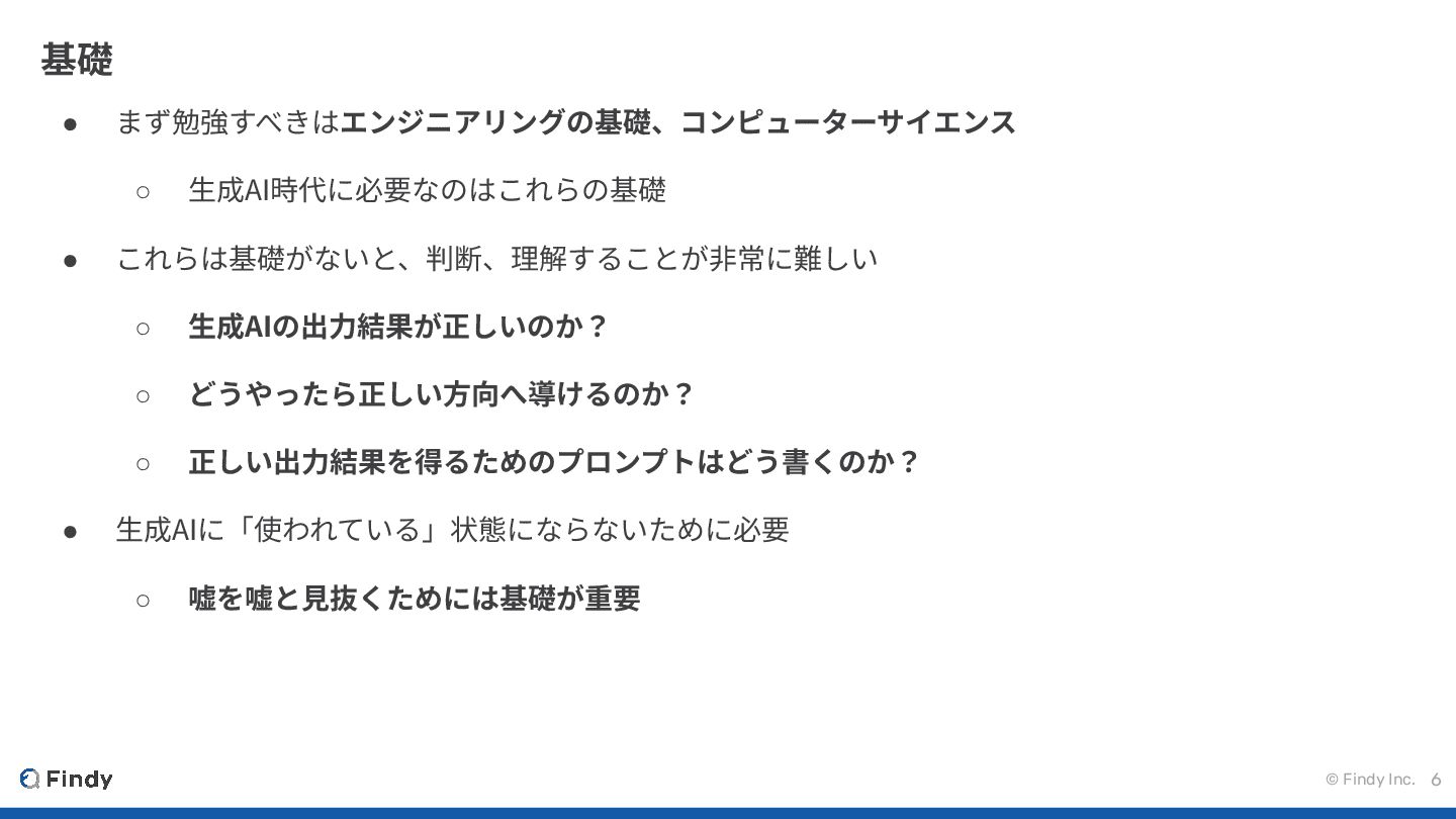 © Findy Inc. 6 基礎 • まず勉強すべきはエンジニアリングの基礎、コンピューターサイエンス ◦ ⽣成AI時代に必要なのはこれらの基礎 •