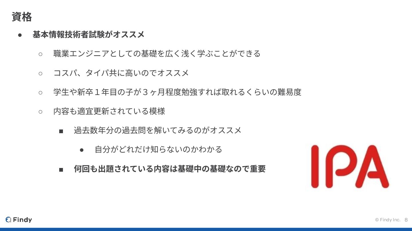© Findy Inc. 8 資格 • 基本情報技術者試験がオススメ ◦ 職業エンジニアとしての基礎を広く浅く学ぶことができる ◦