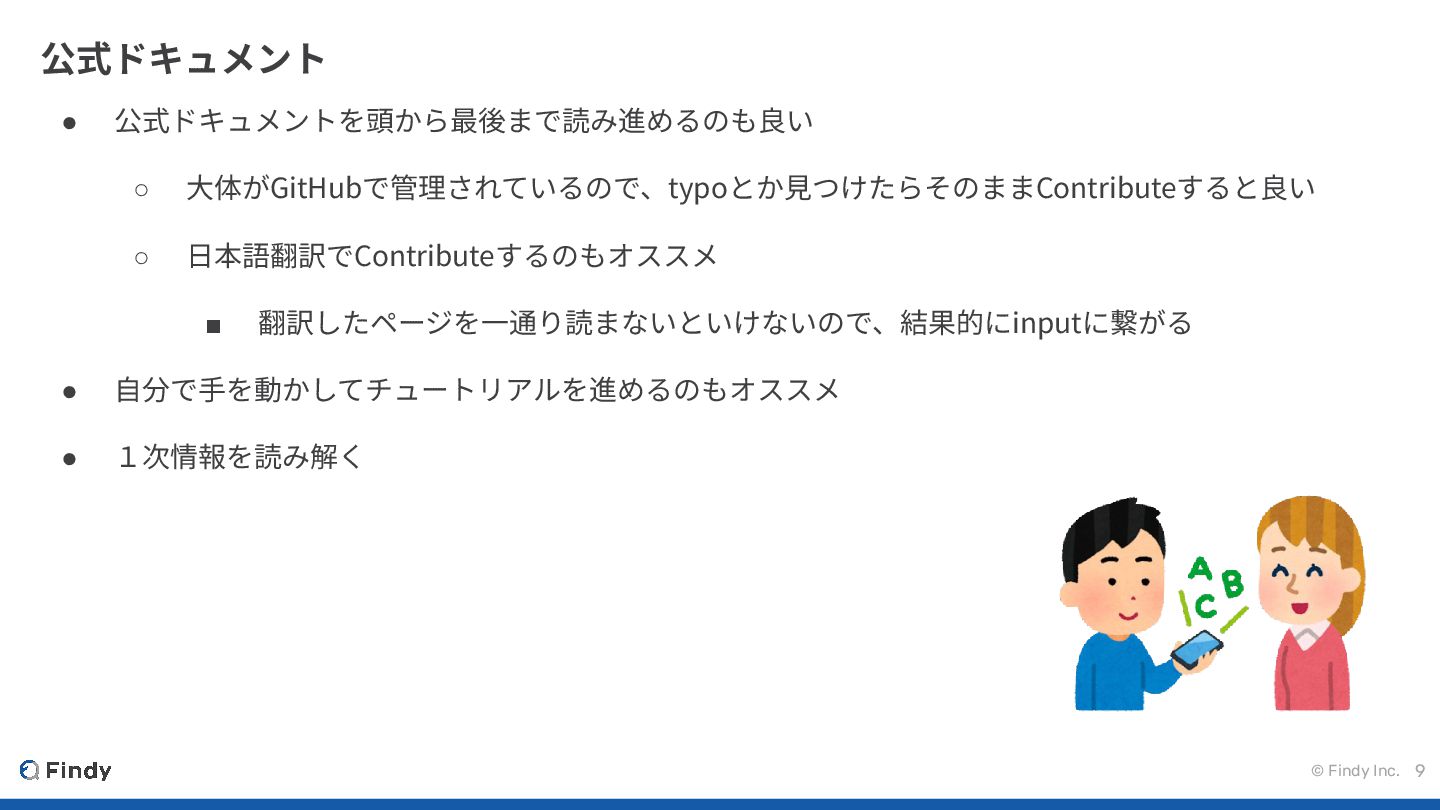 © Findy Inc. 9 公式ドキュメント • 公式ドキュメントを頭から最後まで読み進めるのも良い ◦ ⼤体がGitHubで管理されているので、typoとか⾒つけたらそのままContributeすると良い ◦