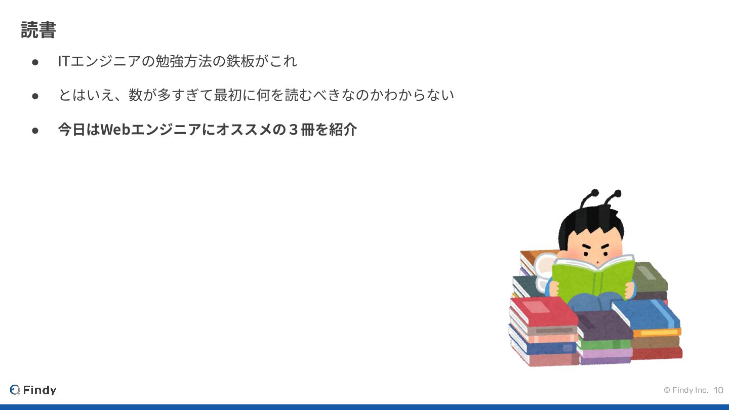 © Findy Inc. 10 読書 • ITエンジニアの勉強⽅法の鉄板がこれ • とはいえ、数が多すぎて最初に何を読むべきなのかわからない •